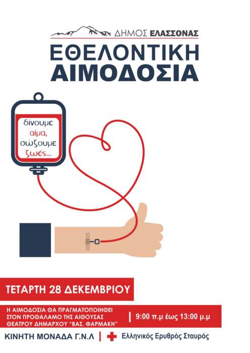 Εθελοντική αιμοδοσία για την ενίσχυση της τράπεζας αίματος του δήμου διοργανώνει την Τετάρτη 28 Δεκεμβρίου 2022 ο Δήμος Ελασσόνας από τις 9:00 π.μ. έως τις 13:00 μ.μ. στον προθάλαμο της Αίθουσας Θεάτρου Δημάρχου “Βασ. Φαρμάκη ” ( είσοδος από παραποτάμια οδό ).
