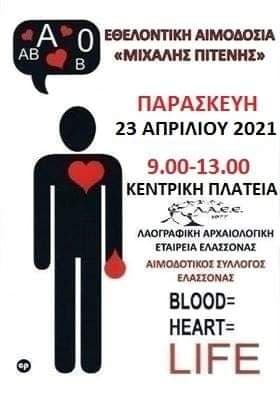 Η Λαογραφική – Αρχαιολογική Εταιρία Ελασσόνας και ο αιμοδοτικός σύλλογος Ελασσόνας, προσκαλούν τους εθελοντές αιμοδότες αλλά και όσους επιθυμούν να γίνουν, στην εθελοντική αιμοδοσία «ΜΙΧΑΛΗΣ ΠΙΤΕΝΗΣ» που θα πραγματοποιηθεί Παρασκευή, 23 Απριλίου 2021 τις ώρες από 9.00 το πρωί μέχρι τη 1.00 το μεσημέρι, στην κεντρική πλατεία Ελασσόνας.