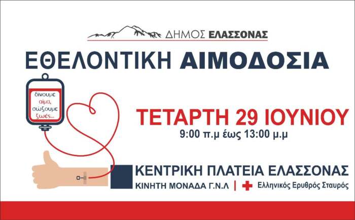 Εθελοντική αιμοδοσία για την ενίσχυση της τράπεζας αίματος του Δήμου διοργανώνει την Τετάρτη 29 Ιουνίου 2022 ο Δήμος Ελασσόνας από τις 9:00 π.μ. έως τις 13:00 μ.μ. στον χώρο του ΚΑΠΗ στην Κεντρική Πλατεία Ελασσόνας.