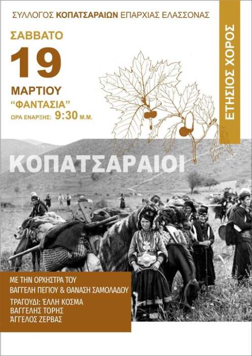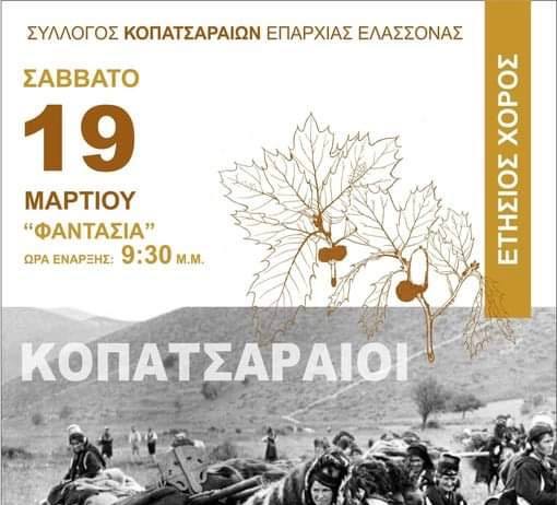 Ο Σύλλογος Κοπατσαραίων Επαρχίας Ελασσόνας πραγματοποιεί τον ετήσιο χορό του το Σάββατο 19 Μαρτίου και ώρα 21.30 στο κέντρο “Φαντασία”