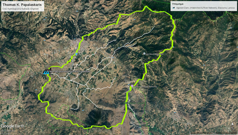 Εικόνα 3. Η απεικόνιση της λεκάνης απορροής, [εξωτερικό περίγραμμα με «ανοιχτή πράσινη» απόχρωση, που αντιστοιχεί έως την θέση όπου πρόκειται να κατασκευαστεί το «Φράγμα “Αγιονερίου” “Ποταμού Ελασσονίτη”», (“Δήμου Ελασσόνας”), “Περιφερειακής Ενότητας (Π.Ε.) Λάρισας”»], και του (πλήρως ανεπτυγμένου) αντίστοιχου, περιεχόμενου σε αυτήν, υδρογραφικού δικτύου (γραμμές με «λευκή» απόχρωση), του «Ποταμού Ελασσονίτη» (που αντιστοιχεί έως την θέση όπου πρόκειται να κατασκευαστεί το «Φράγμα “Αγιονερίου” “Ποταμού Ελασσονίτη”», (“Δήμου Ελασσόνας”), “Περιφερειακής Ενότητας (Π.Ε.) Λάρισας”»), επί του υπόβαθρου της διαδικτυακής πλατφόρμας «Google Earth», [1,2,4,10].
