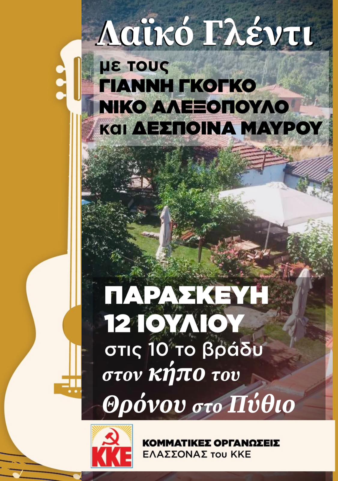 Την Παρασκευή 12-07-2024 στο Πύθιο στον κήπο του Θρόνου οι κομματικές οργανώσεις Ελασσόνας του ΚΚΕ διοργανώνουν λαϊκό γλέντι στην σκιά και την δροσιά του Ολύμπου