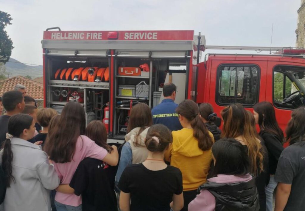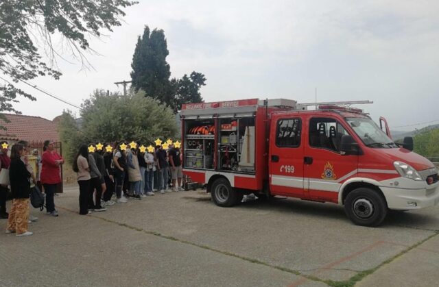 Μετά την ενημέρωση έγινε επίδειξη των οργάνων πυρόσβεσης και απεγκλώβισης ατόμων, που μεταφέρει ένα πυροσβεστικό όχημα, καθώς και χρήση της μάνικας εκτόξευσης νερού.