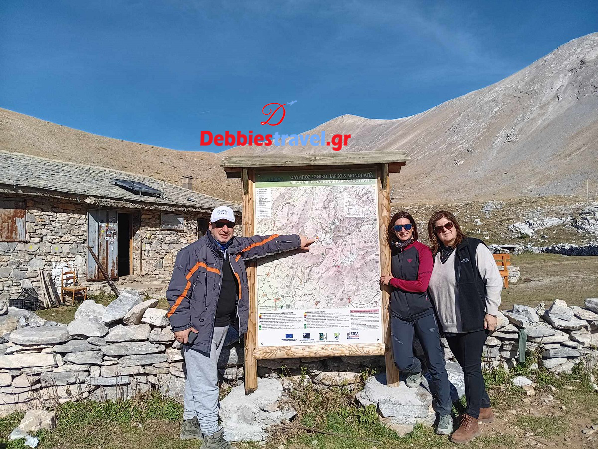 Από αριστερά: Γιάννης Σαμώτας (γενικός διευθυντής ΑΕΝΟΛ Α.Ε.), Φανή Σαμαρά (μηχανικός – υπεύθυνη μελέτης σηματοδότησης και πινακίδων), Σεβαστή Μπασδέκη (συντονίστρια προγράμματος Leader) στο καταφύγιο ‘Χρηστάκης’ στα 2.450 μ.
