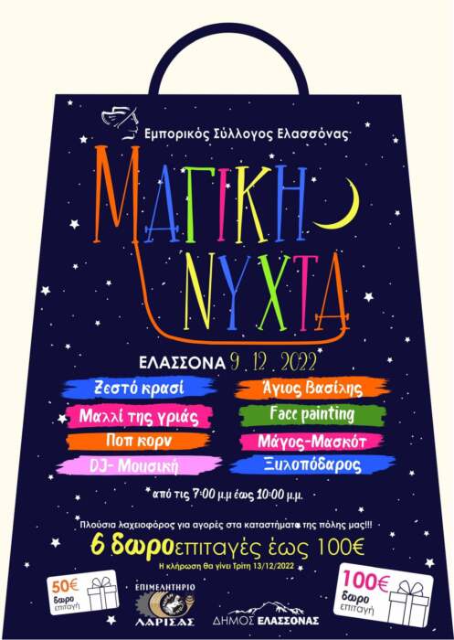 Μια «Μαγική Νύχτα», υπόσχεται ο Εμπορικός Σύλλογος Ελασσόνας σε καταναλωτές, επισκέπτες και καταστηματάρχες την Παρασκευή 9 Δεκεμβρίου 2022.
