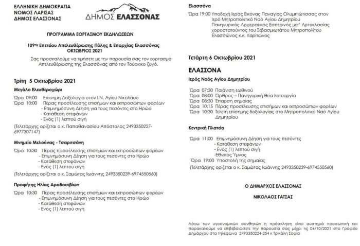 Εορταστικές εκδηλώσεις θα πραγματοποιηθούν για την 109η επέτειο απελευθέρωσης της πόλης και της επαρχίας Ελασσόνας από τον τουρκικό ζυγό.