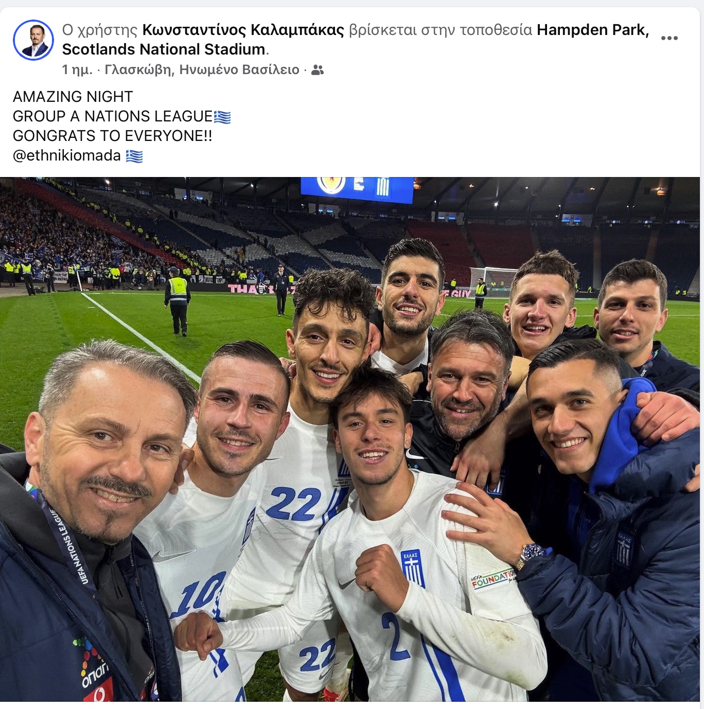 Σε ανάρτησή του στο Facebook ο Λαρισαίος Κωνσταντίνος Καλαμπάκας, φυσιοθεραπευτής του γαλανόλευκου συγκροτήματος, μοιράστηκε μία φωτογραφία αμέσως μετά τη λήξη του Σκωτία-Ελλάδα 0-3 αγκαλιά με τους ποδοσφαιριστές της “επίσημης αγαπημένης”