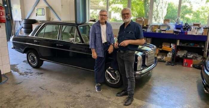«Με τον μηχανικό μου Πάνο Αβραμίδη της MKB στο Winmenden. Η τέλεια επισκευή της σπάνιας Mercedes 250/8 από την μοναδική στο ειδος MKB που κράτησε τρία χρόνια αποτελεί για μένα φόρο τιμής στη μνήμη του πρώην ιδιοκτήτη της Αλεξάνδρου Ωνάση. Ένα μεγάλο ευχαριστώ στον μεγάλο τεχνίτη των classic cars restorations, στον τεχνικό μου σύμβουλο στη Γερμανία Στάθη Πρεδαρη, και στον μάγο των ρυθμίσεων κινητήρων της Mercedes Γιάννη Παρχαρίδη».