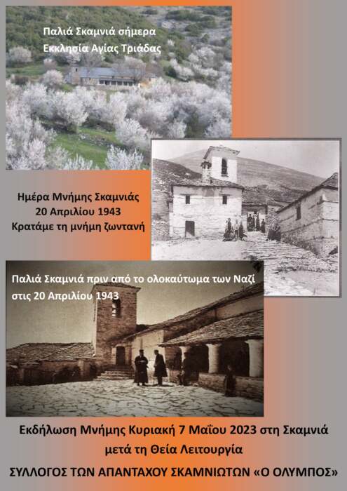 Ο Σύλλογος των Απανταχού Σκαμνιωτών διοργανώνει εκδήλωση μνήμης με αφορμή τη συμπλήρωση ογδόντα χρόνων από την Ημέρα της ολοσχερούς καταστροφής του χωριού από τους Γερμανούς κατακτητές-με το κάψιμο όλων των σπιτιών (20 Απριλίου 1943) και μοναδικό σωσμένο κτίσμα την εκκλησία της Αγίας Τριάδος της Παλιάς Σκαμνιάς, μνημείο ιστορικής, θρησκευτικής και πολιτιστικής κληρονομιάς σήμερα, σε μια περιοχή φυσικού κάλλους κάτω από τον Όλυμπο.
