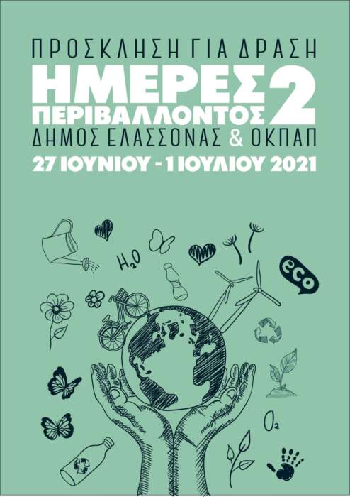 Για 2η συνεχόμενη χρονιά ο Δήμος Ελασσόνας σε συνεργασία με τον Ο.Κ.Π.Α.Π. διοργανώνει τις «Ημέρες Περιβάλλοντος» με μία σειρά εθελοντικών, καλλιτεχνικών και αθλητικών δράσεων για την περιβαλλοντική ευαισθητοποίηση, την άθληση και την ψυχαγωγία που θα διαρκέσουν από την Κυριακή 27 Ιουνίου έως και την Πέμπτη 1 Ιουλίου 2021.