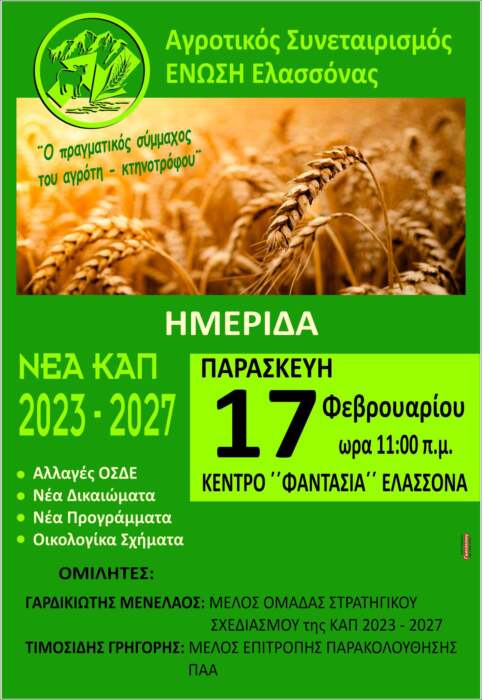 Ημερίδα για τη νέα ΚΑΠ 2023-2027 θα πραγματοποιηθεί από τον Αγροτικό Συνεταιρισμό Ένωσης Ελασσόνας την Παρασκευή 17 Φεβρουαρίου και ώρα 11 πμ στο κέντρο «Φαντασία» στην Ελασσόνα.