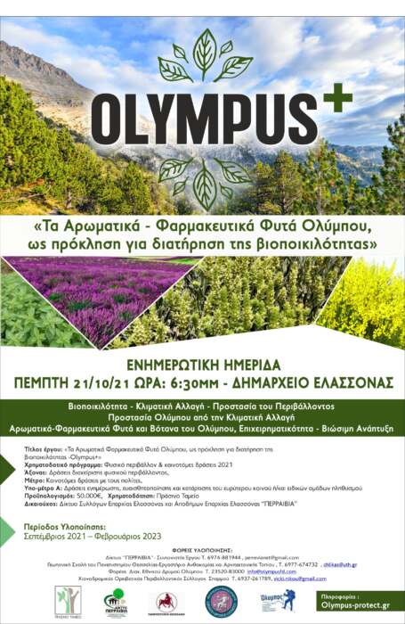 Το Δίκτυο «ΠΕΡΡΑΙΒΙΑ» προσκαλεί όλους τους ενδιαφερόμενους σε μια ενδιαφέρουσα ενημερωτική Ημερίδα, την Τρίτη 29 Αυγούστου 2023 και ώρα 7-9 μ.μ. στο Δημαρχείο της Ελασσόνας, όπου, απ’ όλους τους εμπλεκόμενους, θα γίνει η παρουσίαση των αποτελεσμάτων ενός σημαντικού και πρωτοπόρου Έργου με τίτλο «Τα Αρωματικά Φαρμακευτικά Φυτά Ολύμπου, ως πρόκληση για διατήρηση της βιοποικιλότητας -Olympus+», που έχει εγκριθεί από το Πράσινο Ταμείο, στα όρια του Δήμου Ελασσόνας και ολοκληρώνεται στο τέλος Αυγούστου 2023 .
