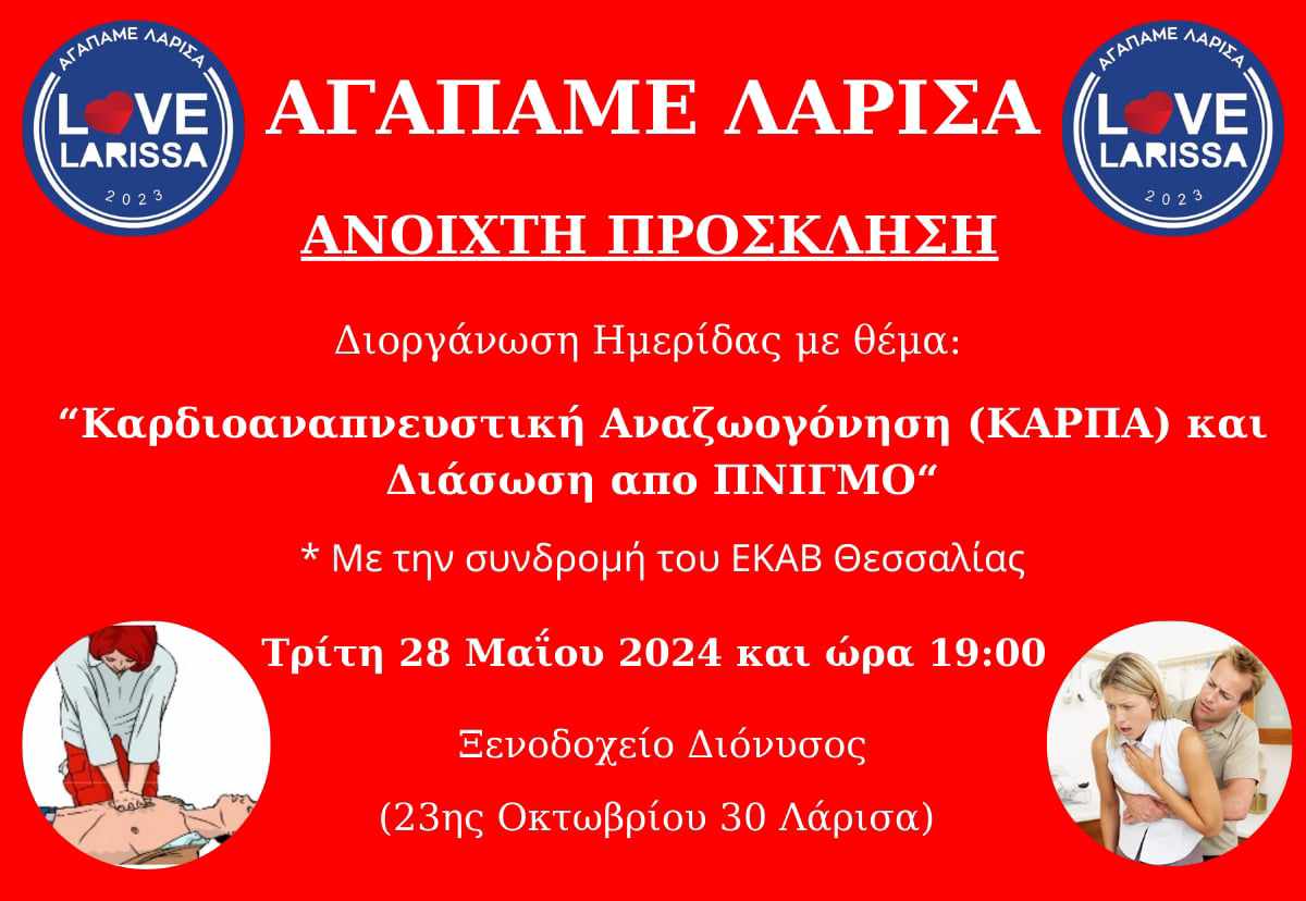 Το σωματείο ΑΓΑΠΑΜΕ ΛΑΡΙΣΑ διοργανώνει ενημερωτική Ημερίδα με θέμα ”Καρδιοαναπνευστική Αναζωογόνηση (ΚΑΡΠΑ) και Διάσωση από Πνιγμό.”