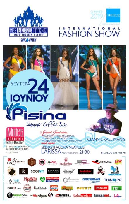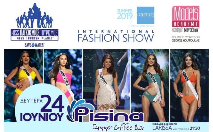 Ένα φαντασμαγορικό σόου μόδας, ένας παγκόσμιος διαγωνισμός ομορφιάς με τη συμμετοχή μοντέλων από όλο τον πλανήτη, υπό την αιγίδα του Ε.Ο.Τ., θα απολαύσουν τη Δευτέρα 24 Ιουνίου στις 9:30 το βράδυ όσοι βρεθούν στον υπέροχο χώρο του PISINA / summer coffee bar στη σκεπαστή αγορά της Νεάπολης στη Λάρισα.