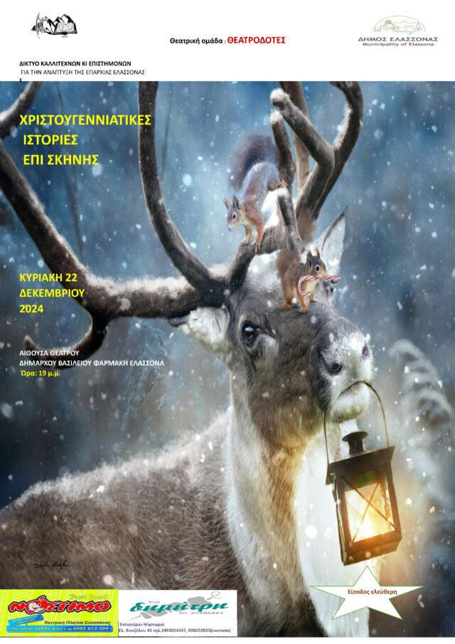 Η ερασιτεχνική θεατρική ομάδα « Θεατροδότες» Ελασσόνας και το «Δίκτυο Καλλιτεχνών κι Επιστημόνων για την Ανάπτυξη της Επαρχίας Ελασσόνας» (ΔΙ.Κ.Ε.Ε.ΕΛ), σε συνδιοργάνωση με τον Δήμο Ελασσόνας, στο πλαίσιο των χριστουγεννιάτικων εκδηλώσεων του Δήμου Ελασσόνας , παρουσιάζει «Ιστορίες επί σκηνής». Πρόκειται για ελεύθερη θεατρική διασκευή τριών χριστουγεννιάτικων διηγημάτων που επιμελήθηκε η σκηνοθέτιδα της ομάδας, Κυριακή- Κορίνα Πάντου. Το πρώτο είναι το διήγημα του συγγραφέα Γιάννη. Δ. Μπάρτζη «Η Βεβήλωση», με τον θεατρικό τίτλο «Η Φάτνη». Το δεύτερο είναι το διήγημα της Κορίνας Πάντου «Συρματόπλεγμα Χριστουγέννων» , με τον θεατρικό τίτλο « Το Συρματόπλεγμα» και το τρίτο είναι το διήγημα της Ελένης Μπλιούμη «Ταξίδι με τον Αηβασίλη», με τον θεατρικό τίτλο «Μαμά, υπάρχει!».