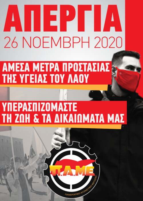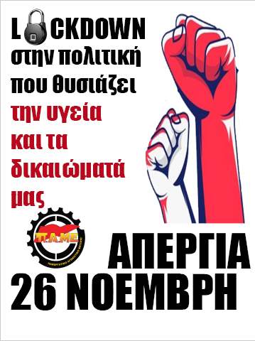 Στην επίθεση εν μέσω καραντίνας, από την κυβέρνηση τη μεγαλοεργοδοσία και τις δυνάμεις που τη στηρίζουν, απαντάμε με Πανεργατική Πανελλαδική Απεργία στις 26 Νοέμβρη.