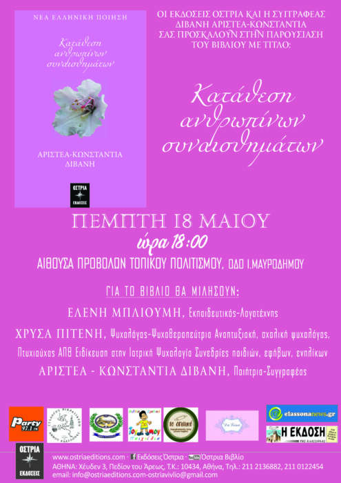 Οι Εκδόσεις ΟΣΤΡΙΑ και η δημοσιογράφος-συγγραφέας, Αριστέα Κωνσταντία Διβανή παρουσιάζουν στην Ελασσόνα, την Πέμπτη 18 Μαΐου 2023 και ώρα 06:00 μ.μ. την ποιητική της συλλογή «Κατάθεση ανθρώπινων συναισθημάτων».