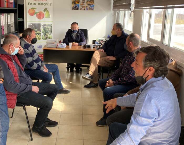 Ο αν. Γραμματέας της Κ.Ο της ΝΔ, βρέθηκε στα γραφεία του Συνεταιρισμού στα Δένδρα, όπου ο Πρόεδρος Χρήστος Τασιούλας και τα μέλη της Διοίκησης του «Γαία Φρούιτ», του μετέφεραν την απογοήτευσή τους για τη μη καταβολή αποζημιώσεων από τον ΕΛΓΑ, για τις ζημιές που υπέστησαν από τον παγετό Μαρτίου – Απριλίου του 2021, τα επιτραπέζια αχλάδια, αμπέλια και ροδάκινα.