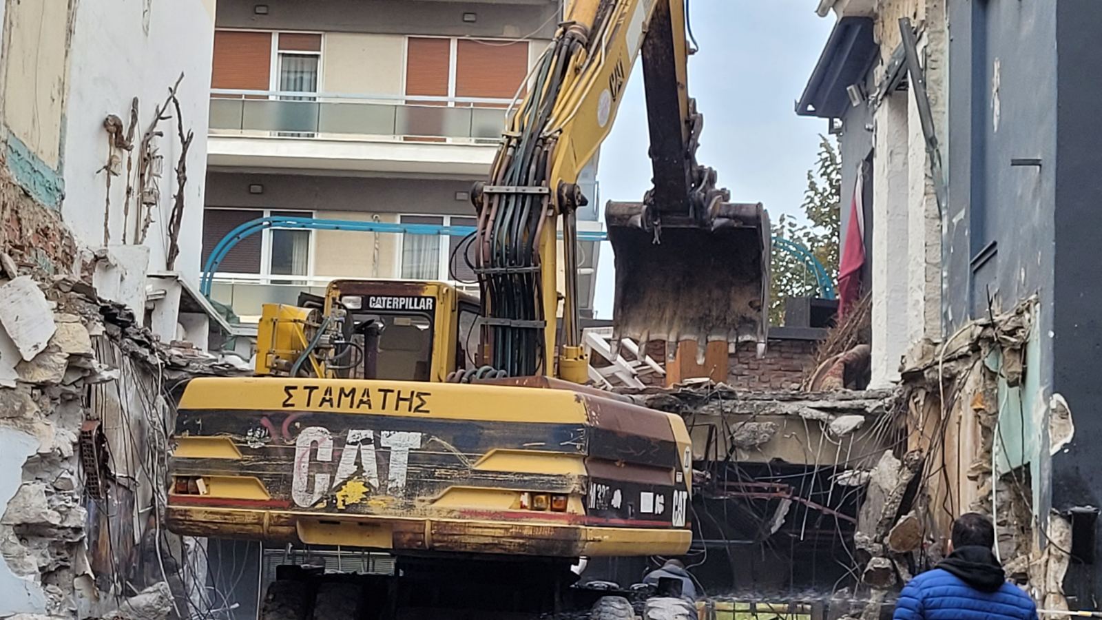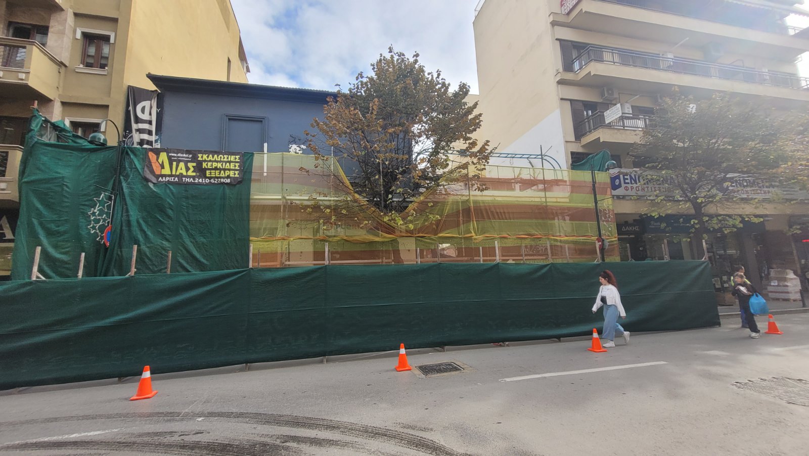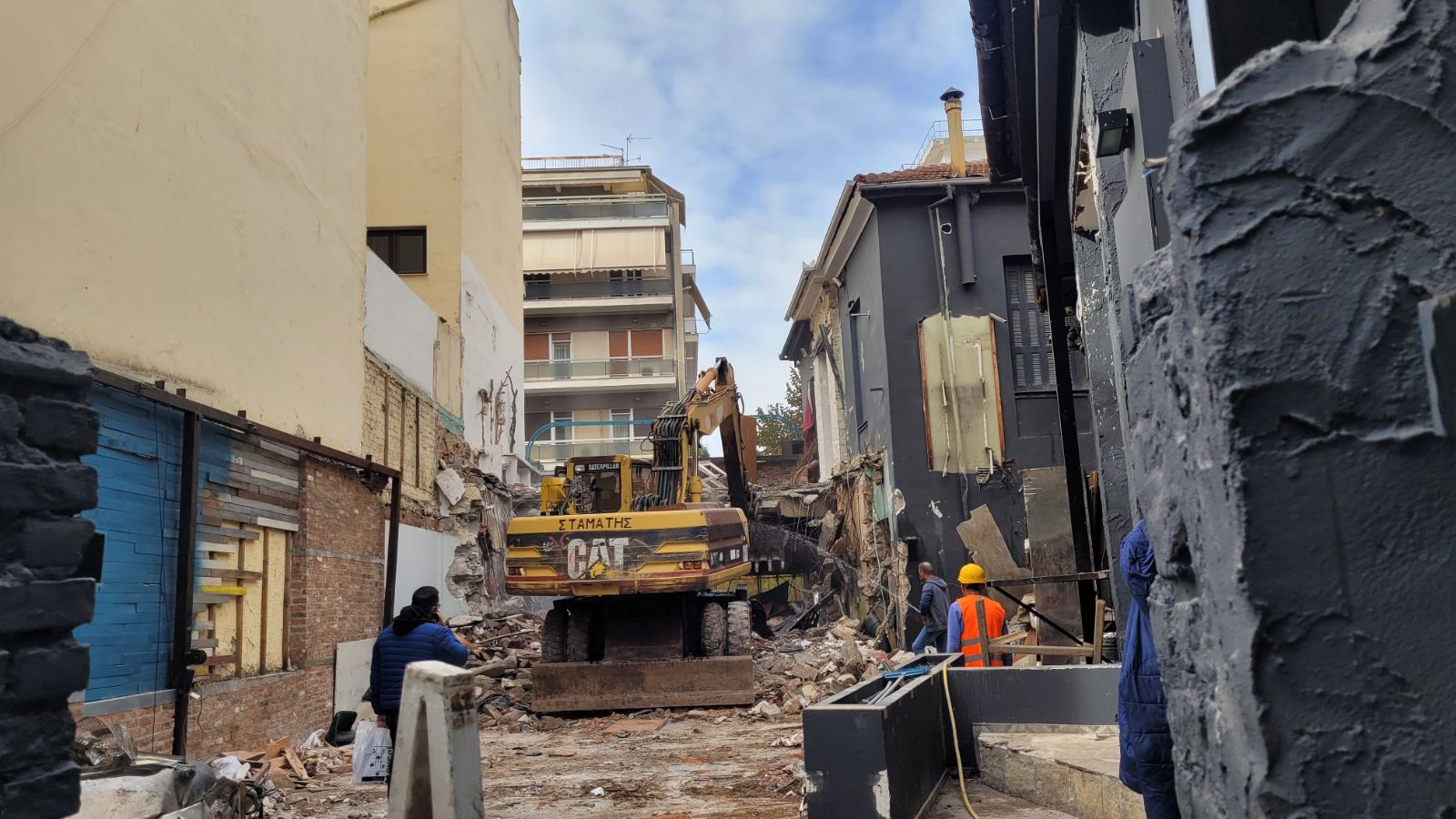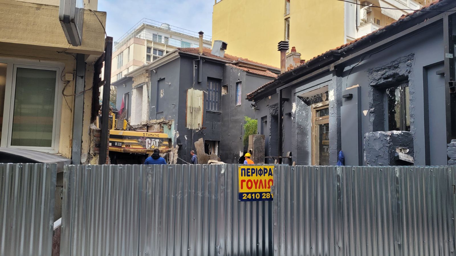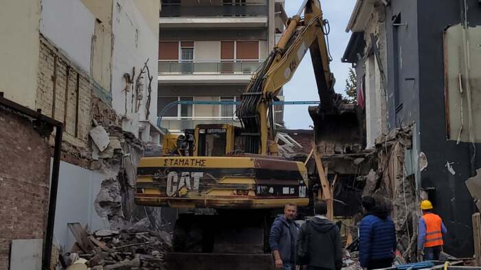 Σήμερα Τετάρτη ξεκίνησαν οι εργασίες της κατεδάφισης από τον πεζόδρομο της Φρίξου, ενώ προστατευτικά πλέγματα έχουν τοποθετηθεί στην Παπαναστασίου.