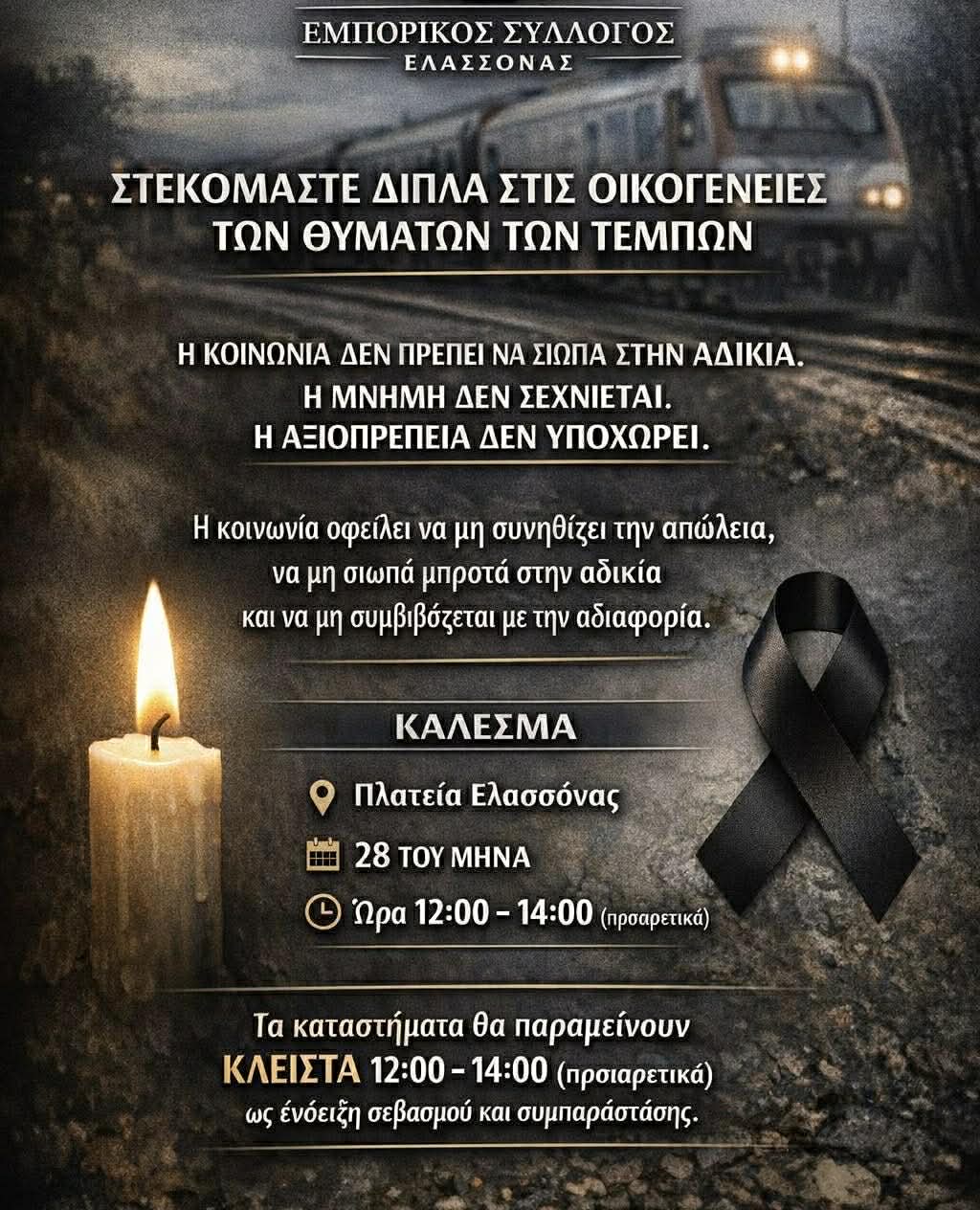 Ο Εμπορικός Σύλλογος Ελασσόνας εκφράζει τη βαθιά του συμπαράσταση στις οικογένειες των θυμάτων της τραγωδίας στα Τέμπη.