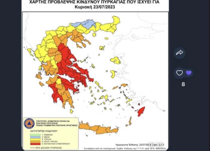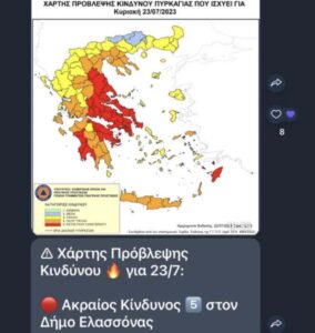 Σε κατάσταση συναγερμού τίθεται η Περιφέρεια Θεσσαλίας καθώς Ακραίος Κίνδυνος Πυρκαγιάς (Κατηγορία Κινδύνου 5 – κόκκινος συναγερμός ) προβλέπεται σήμερα Κυριακή 23 Ιουλίου 2023 στις Π.Ε. Λάρισας και Μαγνησίας σύμφωνα με τον Χάρτη Πρόβλεψης Κινδύνου Πυρκαγιάς που εκδίδει η Γενική Γραμματεία Πολιτικής Προστασίας του Υπουργείου Κλιματικής Κρίσης και Πολιτικής Προστασίας.