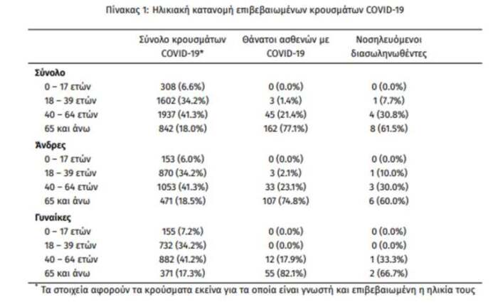 Η μέση ηλικία των κρουσμάτων είναι 45 έτη (εύρος 0 έως 102 ετών), ενώ η μέση ηλικία των θανάτων είναι 76 έτη (εύρος 35 έως 102 ετών). Η ηλικιακή κατανομή των (α) συνολικών κρουσμάτων, (β) των περιστατικών που κατέληξαν σε θάνατο και (γ) των ασθενών που νοσηλεύονται διασωληνωμένοι, είναι η ακόλουθη:
