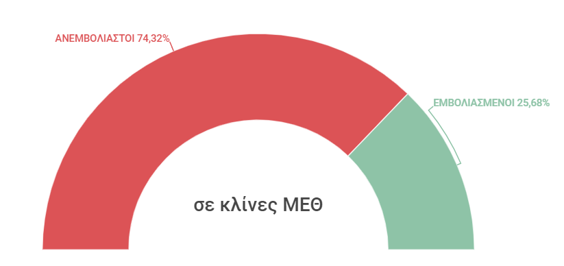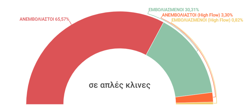 Αυτή την εβδομάδα στις απλές κλίνες έχουμε 65,57% ανεμβολίαστους και 30,31% εμβολιασμένους. High flow χρειάζεται το 3,30% των ανεμβολίαστων έναντι μόλις του 0,82% των εμβολιασμένων. Στην ΜΕΘ είναι το 74,32 % ανεμβολίαστοι και το 25,68% εμβολιασμένοι.