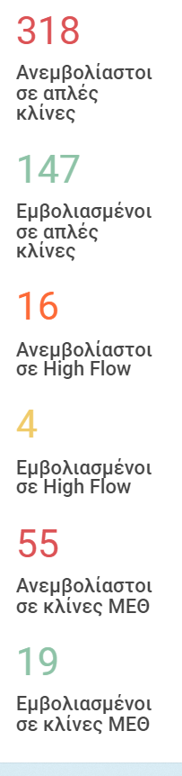 Σε απόλυτους αριθμούς έχουμε 318 ανεμβολίαστους έναντι 147 εμβολισμένων ασθενών σε απλές κλίνες. Στην ΜΕΘ είναι 55 ανεμβολίαστοι και 19 εμβολιασμένοι, ενώ από high flow έχουν ανάγκη 16 ανεμβολίαστοι έναντι μόλις 4 εμβολιασμένων.