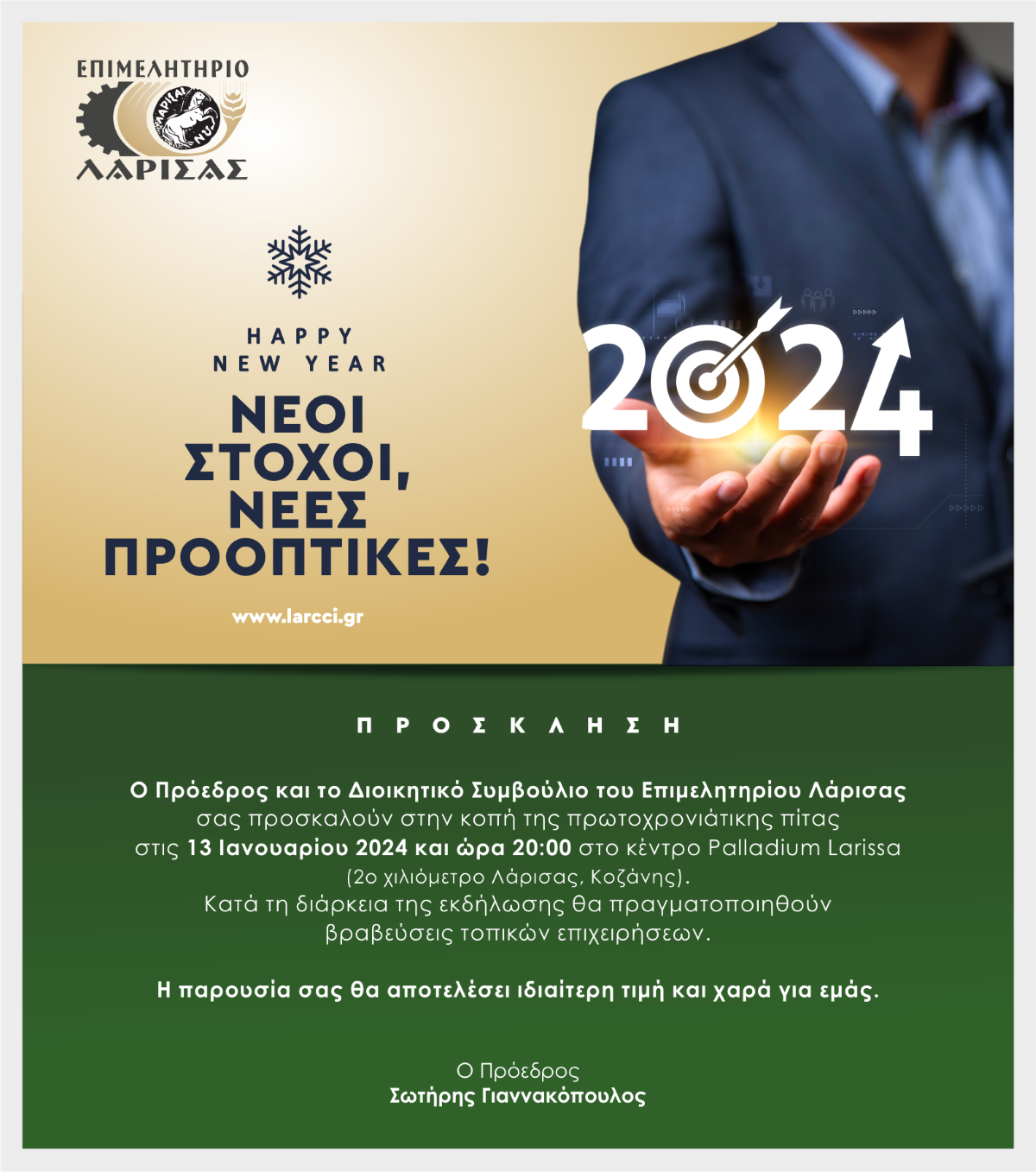 Κόβει την πίτα του και βραβεύει το Επιμελητήριο Λάρισας