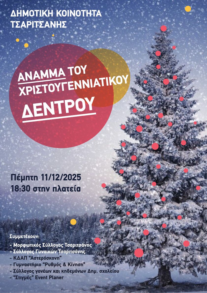 Η Δημοτική Κοινότητα Τσαριτσάνης σας προσκαλεί στην εκδήλωση για το άναμμα του χριστουγεννιάτικου δέντρου, την Πέμπτη 11/12/2025 στην κεντρική πλατεία και ώρα 18.30.