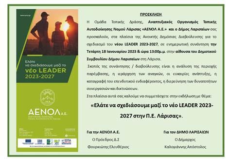 προσκαλούν, στα πλαίσια της Ανοικτής Δημόσιας Διαβούλευσης για το σχεδιασμό του νέου LEADER 2023-2027, σε ενημερωτική συνάντηση την Τετάρτη 18 Ιανουαρίου 2023 & ώρα 13:00μ.μ. στην αίθουσα του Δημοτικού Συμβουλίου Δήμου Λαρισαίων στη Λάρισα.
