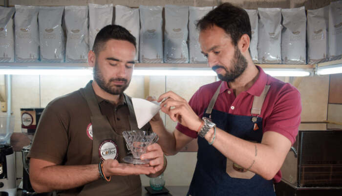 «Μια ομάδα με διαφορετική προσέγγιση στο concept “καφές” στις μηχανές, στην εκπαίδευση του προσωπικού, στις ποικιλίες του καφέ, στην τεχνογνωσία», μου λένε οι δυο τους, εξηγώντας μου πως η δική τους προσέγγιση εστιάζει σε όχι τόσο αυτοματοποιημένη παραγωγή καφέ, αλλά στην ανάδειξη του καλού και ελεύθερου, συγκροτημένου και εξειδικευμένου, barista, ο οποίος θα μπορεί να ετοιμάσει έναν εξαιρετικό, σε γεύση και αρώματα, καφέ.