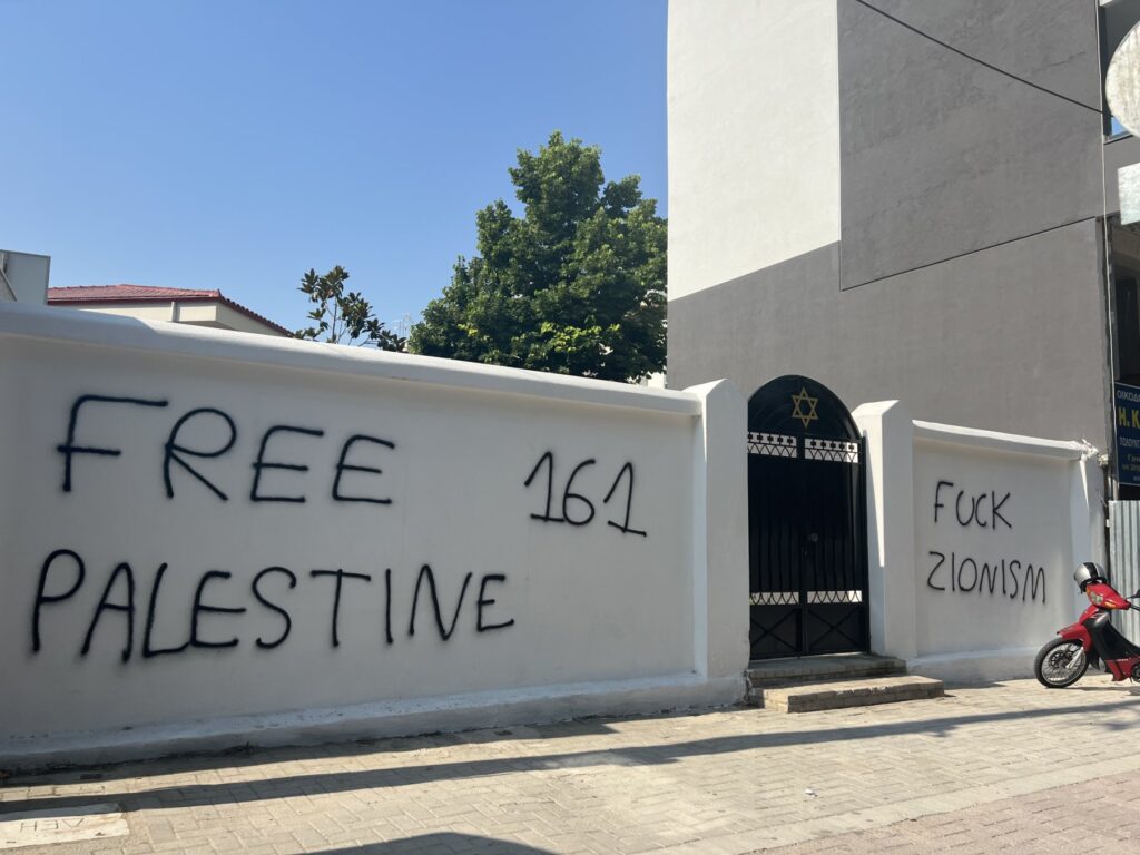 Μόλις μία ημέρα μετά τον βανδαλισμό του Μνημείου Εβραίων Μαρτύρων του Ολοκαυτώματος με κόκκινη μπογιά, σήμερα, πρωί Παρασκευής άγνωστοι έγραψαν συνθήματα στον εξωτερικό χώρο της Συναγωγής επί της οδού Κύπρου.