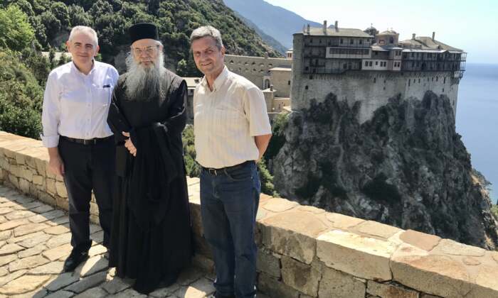 Φωτ. 1) Ο Μάξιμος Χαρακόπουλος στο επιβλητικό μοναστήρι της Σιμωνόπετρας, με τον π. Ιουστίνο και τον Λαρισαίο προσκυνητή Τριαντάφυλλο Ζαχαρούδη.