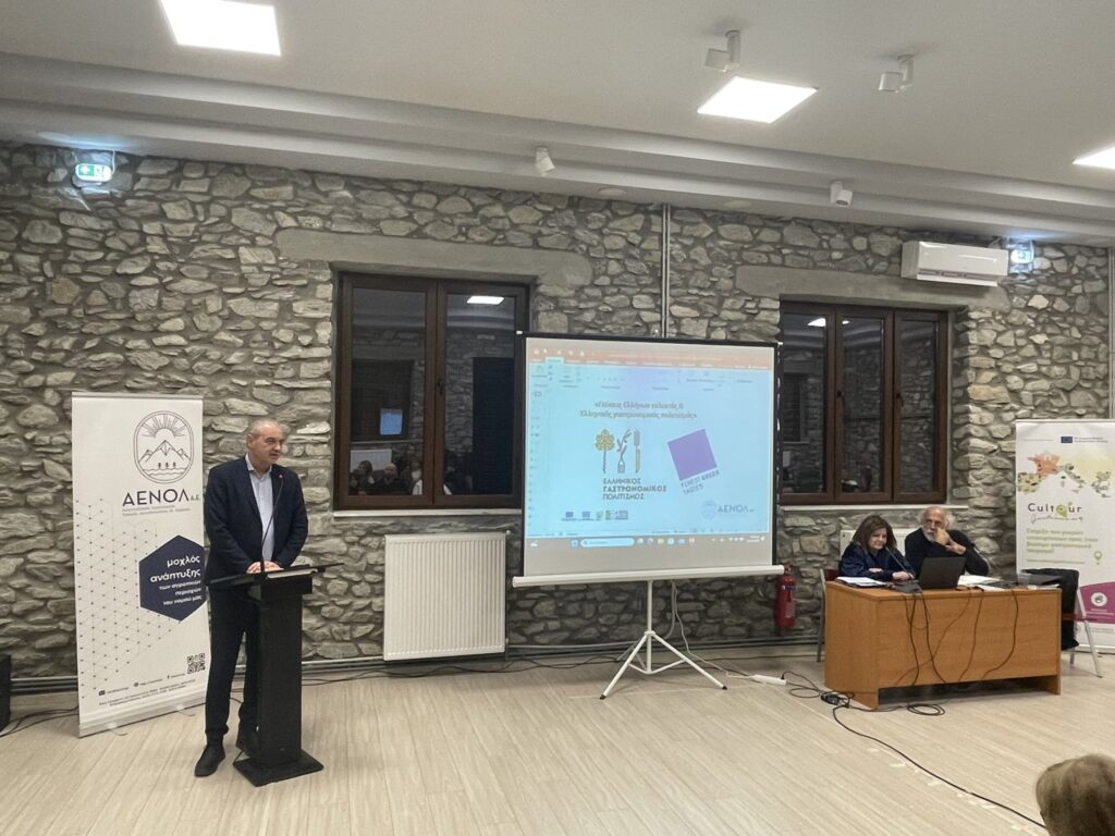 Χαιρετισμό απηύθυνε ο Πρόεδρος της ΑΕΝΟΛ Α.Ε. Ν. Γάτσας, ο οποίος μεταξύ άλλων ανέφερε: «Η εσπερίδα απευθύνεται στους ανθρώπους της παραγωγής, της μεταποίησης, της εστίασης και του τουρισμού. Η ΑΕΝΟΛ Α.Ε. όλα αυτά τα χρόνια απέδειξε ότι μπορεί να ανταποκριθεί στις προκλήσεις και να δημιουργήσει τις συνθήκες, για να ενισχυθούν οι επενδύσεις στον κλάδο του τουρισμού και της γαστρονομίας. Τα προϊόντα της περιοχής μας φημίζονται για τις ξεχωριστές γεύσεις και θα πρέπει να υποστηριχθούν οι επιχειρηματίες να λειτουργήσουν συνεργατικά, για μεγαλύτερη προβολή και προώθηση του γαστρονομικού πολιτισμού, με τη συμμετοχή στις γαστρονομικές κοινότητες που μελετούμε σήμερα. Ο καθένας μόνος του δεν μπορεί να καταφέρει τόσο πολλά, όσα μπορούν μαζί τα μέλη μιας κοινότητας».