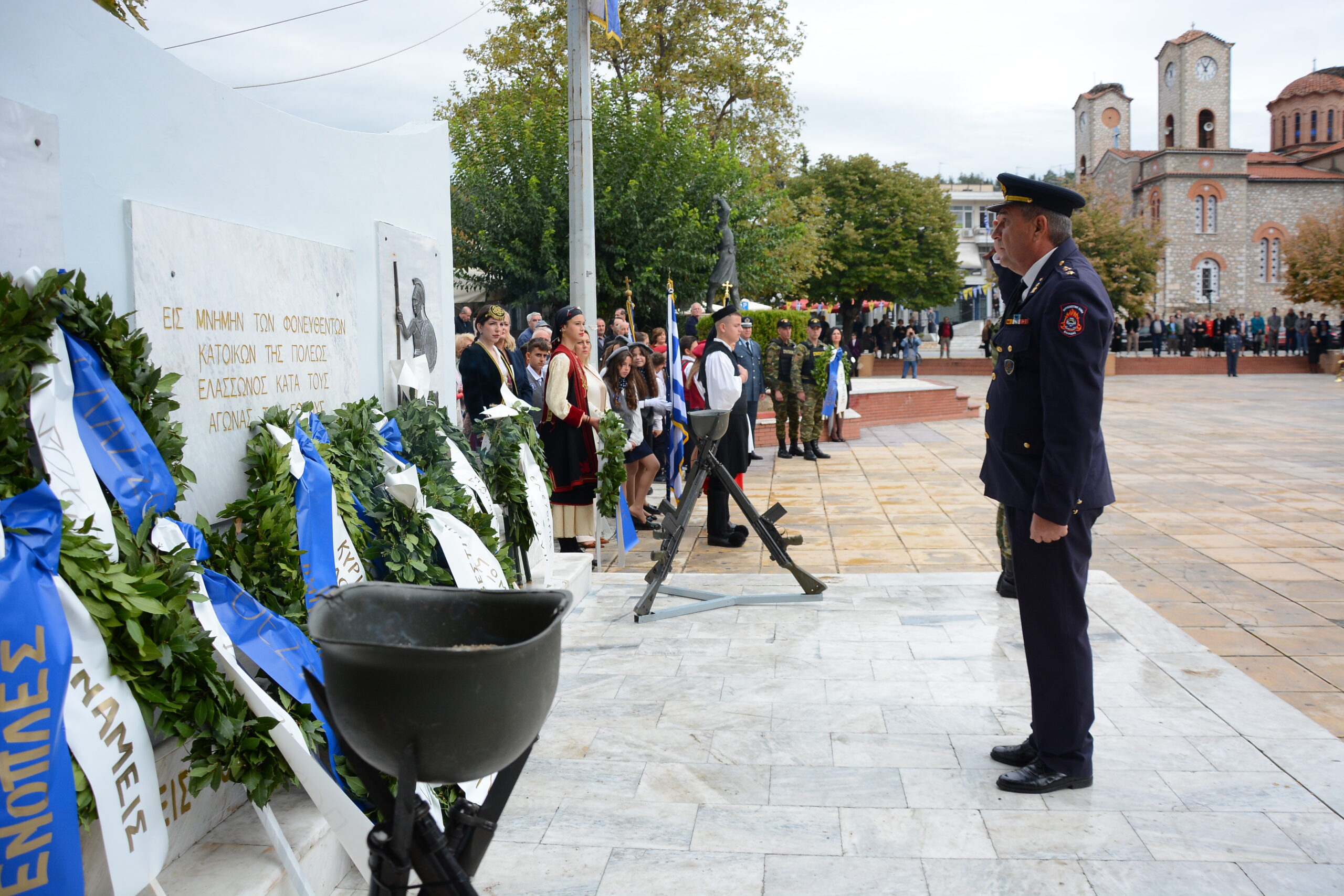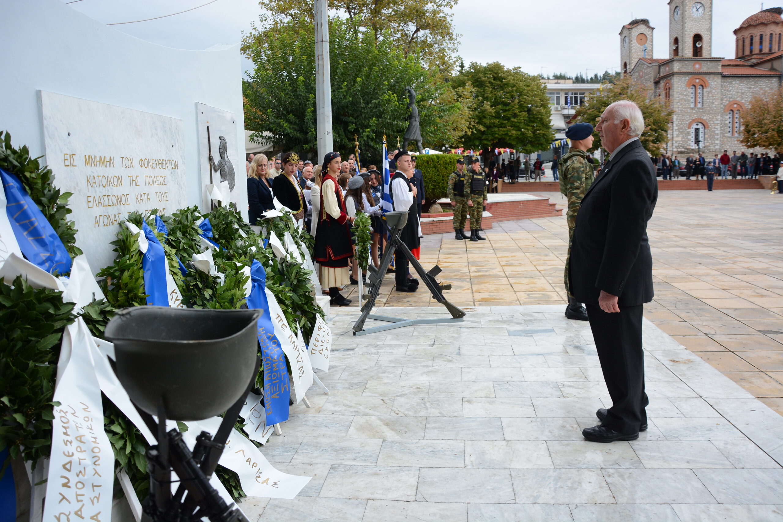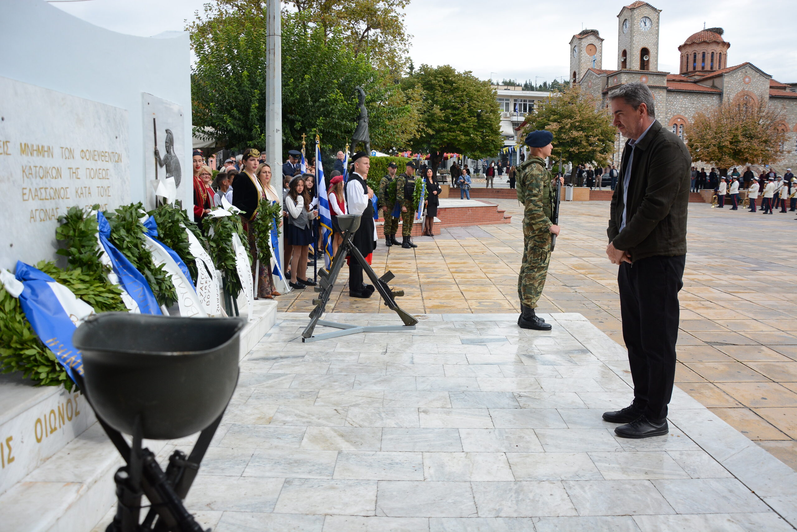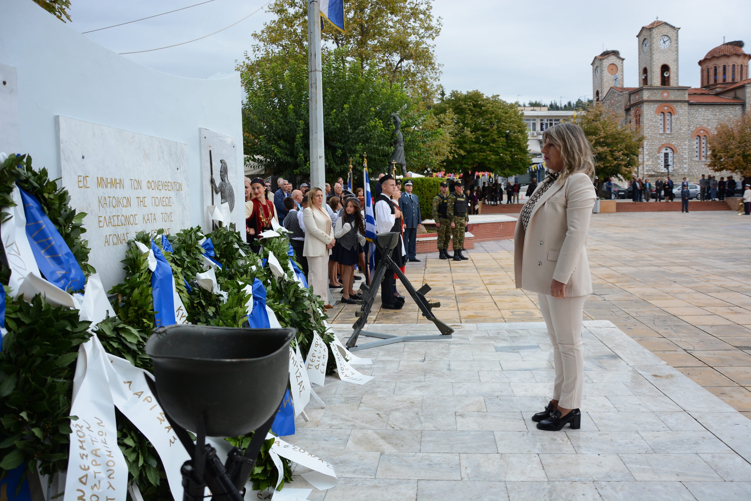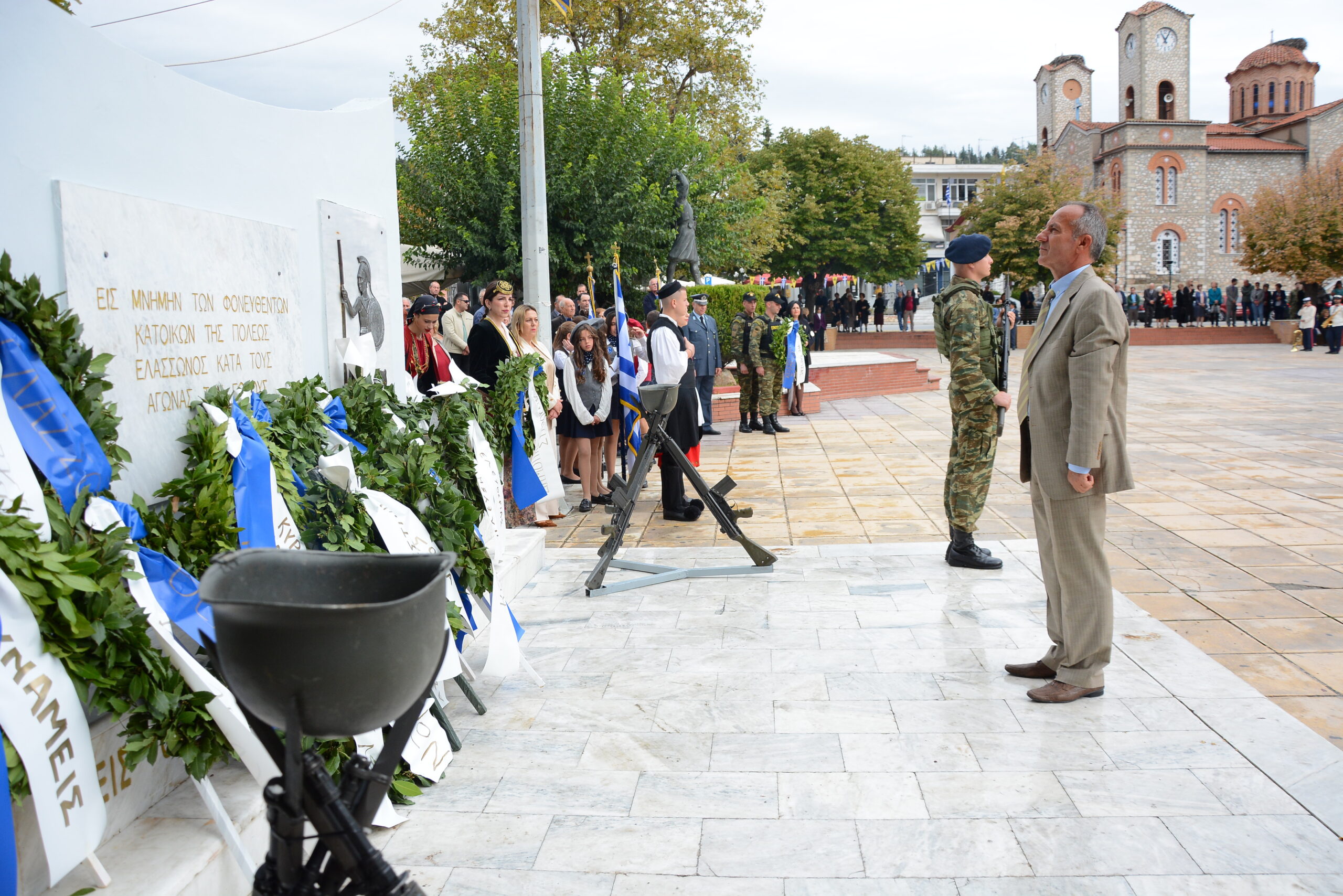 Στον Ιερό Μητροπολιτικό Ναό του Αγίου Δημητρίου εψάλη επίσημη δοξολογία προεξάχοντος του Επισκόπου Αμφιπόλεως κ. Χριστοφόρου, συγχοροστατούντος του Σεβασμιωτάτου Μητροπολίτου Ελασσόνας κ. Χαρίτωνα, ενώ στη συνέχεια έγινε επιμνημόσυνη δέηση για τους πεσόντες, εκφώνηση του πανηγυρικού της ημέρας από την κα Ελένη Μπλιούμη Διευθύντρια Δημοτικού Σχολείου Καλλιθέας, κατάθεση στεφάνων και τέλος τηρήθηκε ενός λεπτού σιγή στη μνήμη των πεσόντων νεκρών και ανακρούστηκε ο Εθνικός Ύμνος.