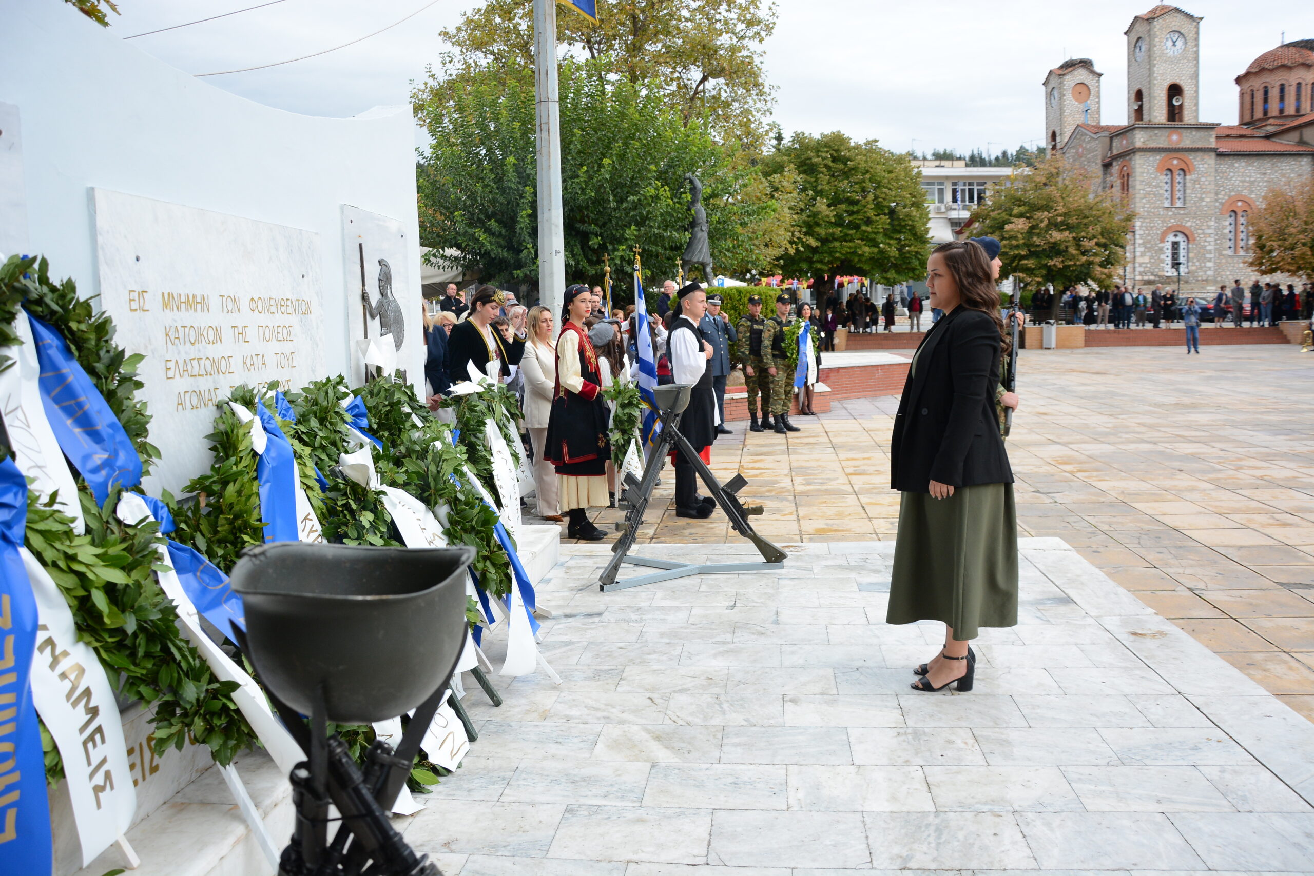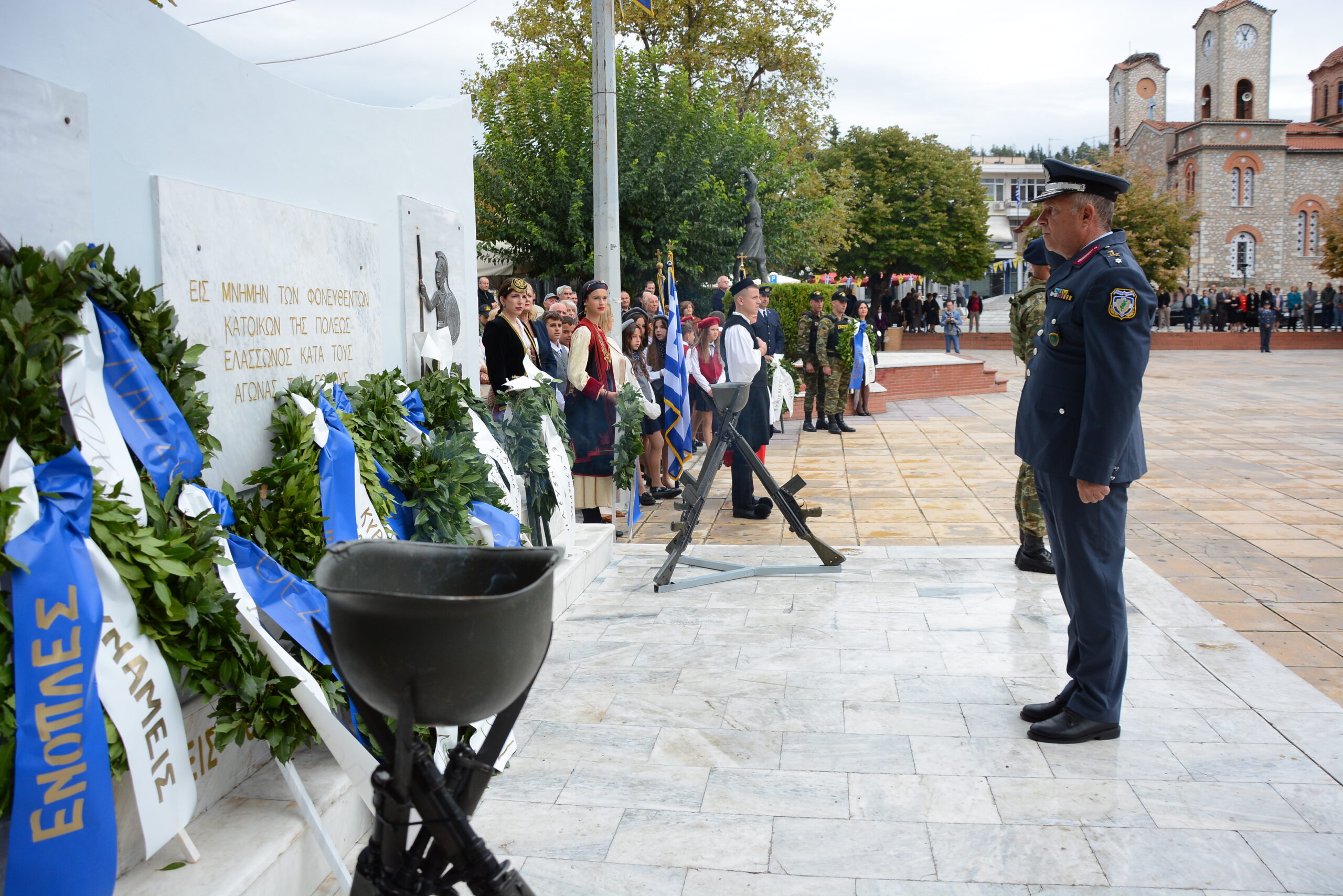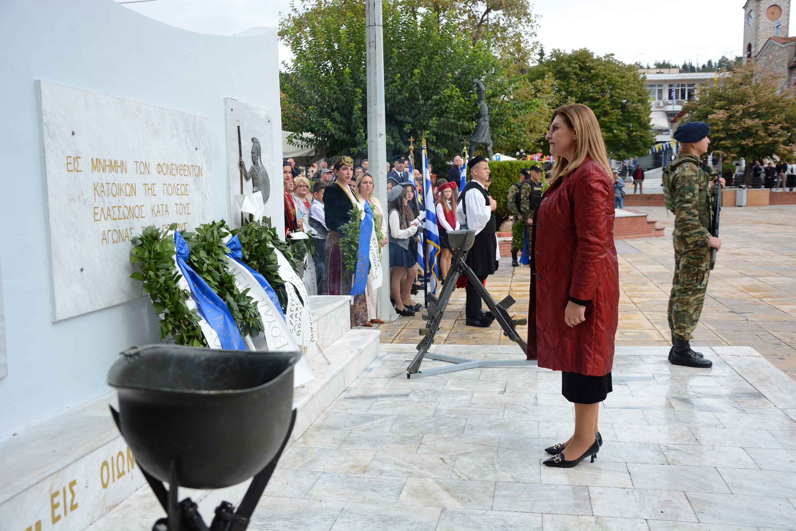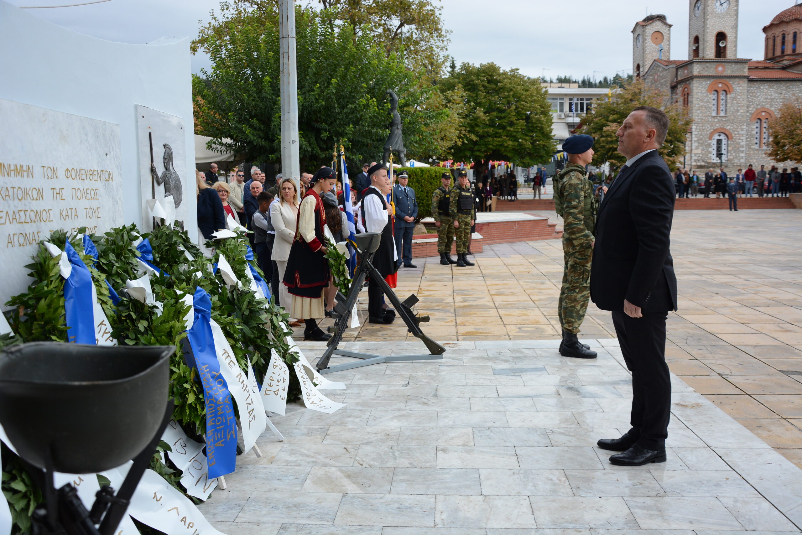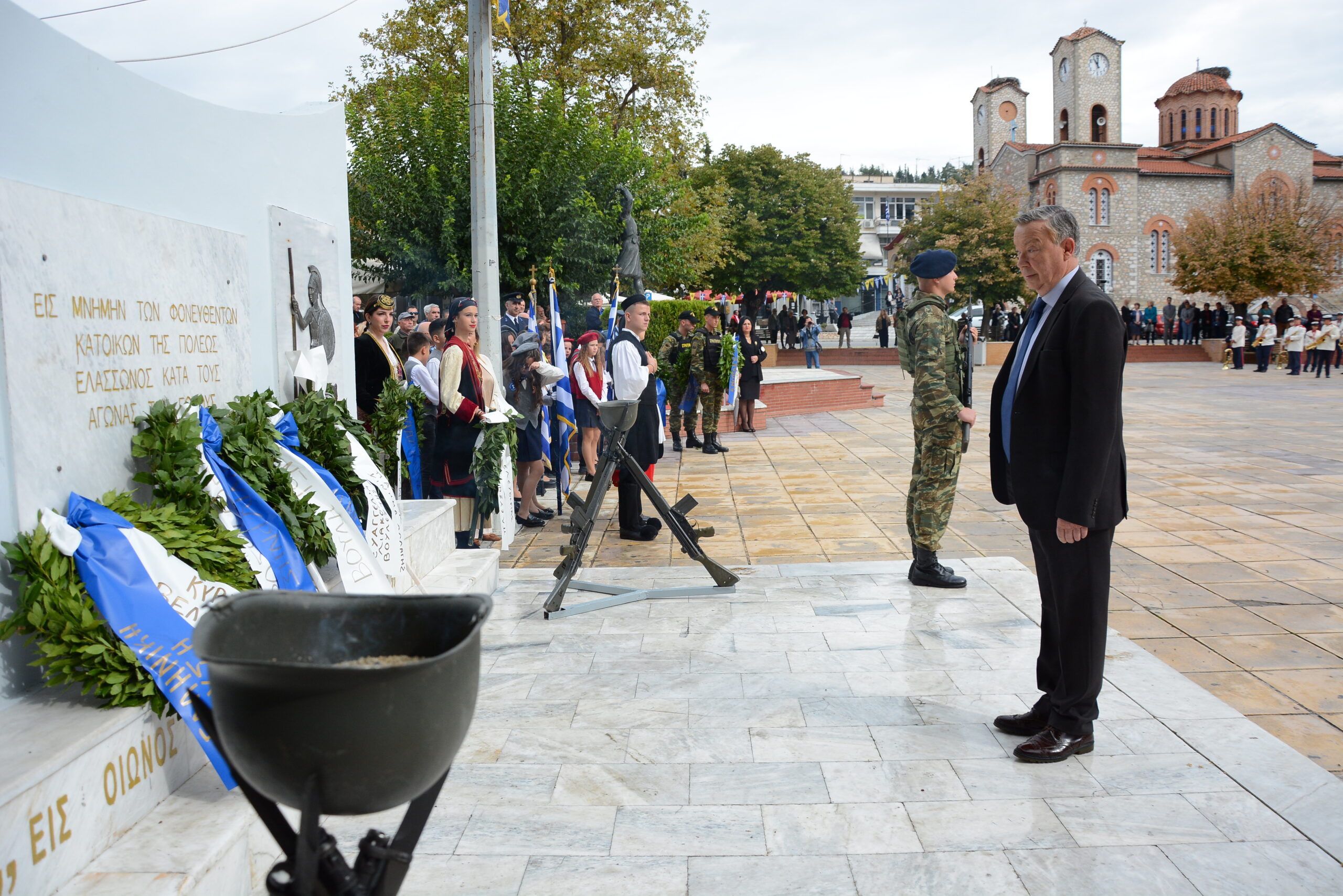 Στον Ιερό Μητροπολιτικό Ναό του Αγίου Δημητρίου εψάλη επίσημη δοξολογία προεξάχοντος του Επισκόπου Αμφιπόλεως κ. Χριστοφόρου, συγχοροστατούντος του Σεβασμιωτάτου Μητροπολίτου Ελασσόνας κ. Χαρίτωνα, ενώ στη συνέχεια έγινε επιμνημόσυνη δέηση για τους πεσόντες, εκφώνηση του πανηγυρικού της ημέρας από την κα Ελένη Μπλιούμη Διευθύντρια Δημοτικού Σχολείου Καλλιθέας, κατάθεση στεφάνων και τέλος τηρήθηκε ενός λεπτού σιγή στη μνήμη των πεσόντων νεκρών και ανακρούστηκε ο Εθνικός Ύμνος.