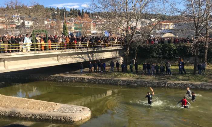 Στις 10.30 πμ πομπή με επικεφαλής τη Φιλαρμονική του Δήμου Ελασσόνας θα κατευθυνθεί στη γέφυρα του ποταμού Ελασσονίτη και θα λάβει χώρα η καθιερωμένη ρίψη του Τιμίου Σταυρού. Θα λάβουν μέρος κατά το έθιμο νεαροί κολυμβητές. Με την επιστροφή – παράδοση του Σταυρού, ο Μητροπολίτης δωρίζει αναμνηστικό δώρο στον κολυμβητή – «νικητή» και η πομπή επανέρχεται στο Μητροπολιτικό Ναό, όπου γίνεται και η Απόλυση.