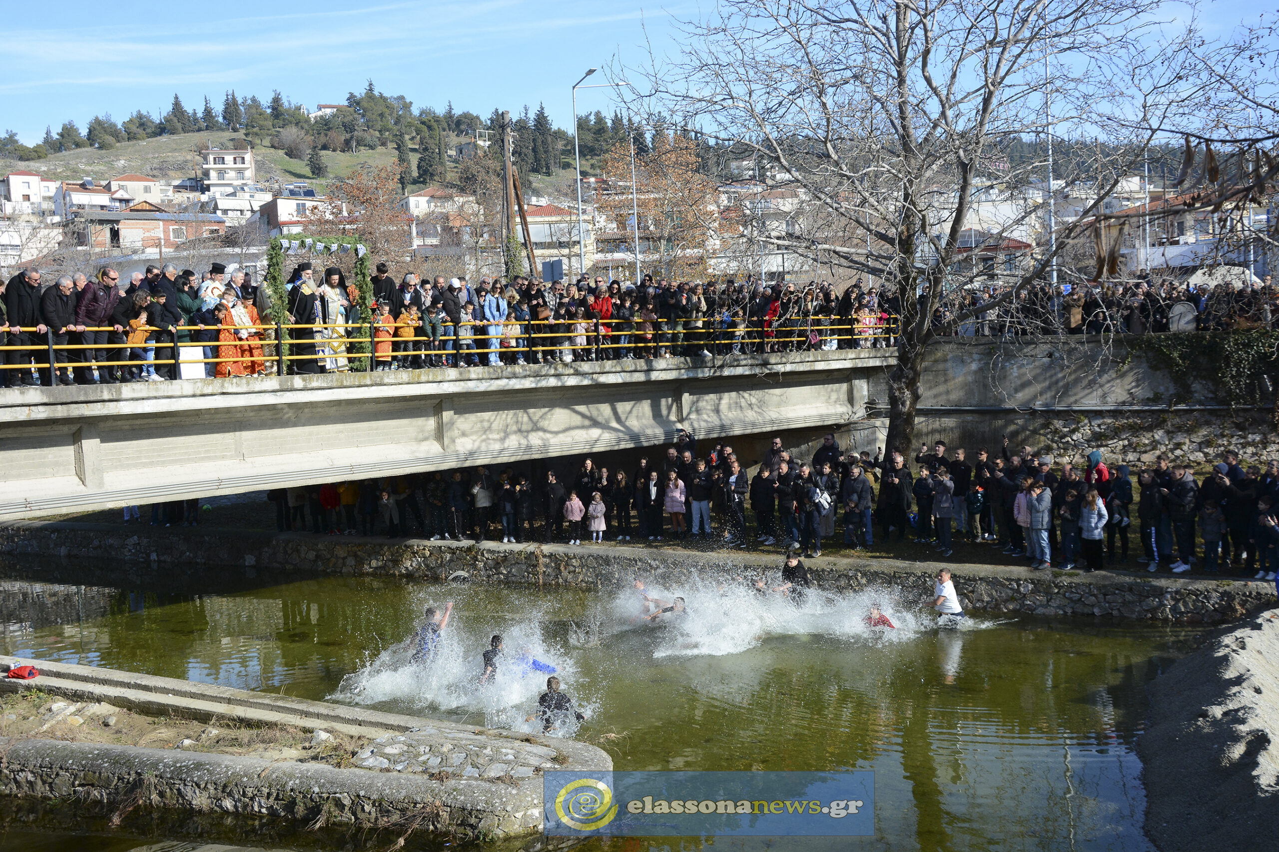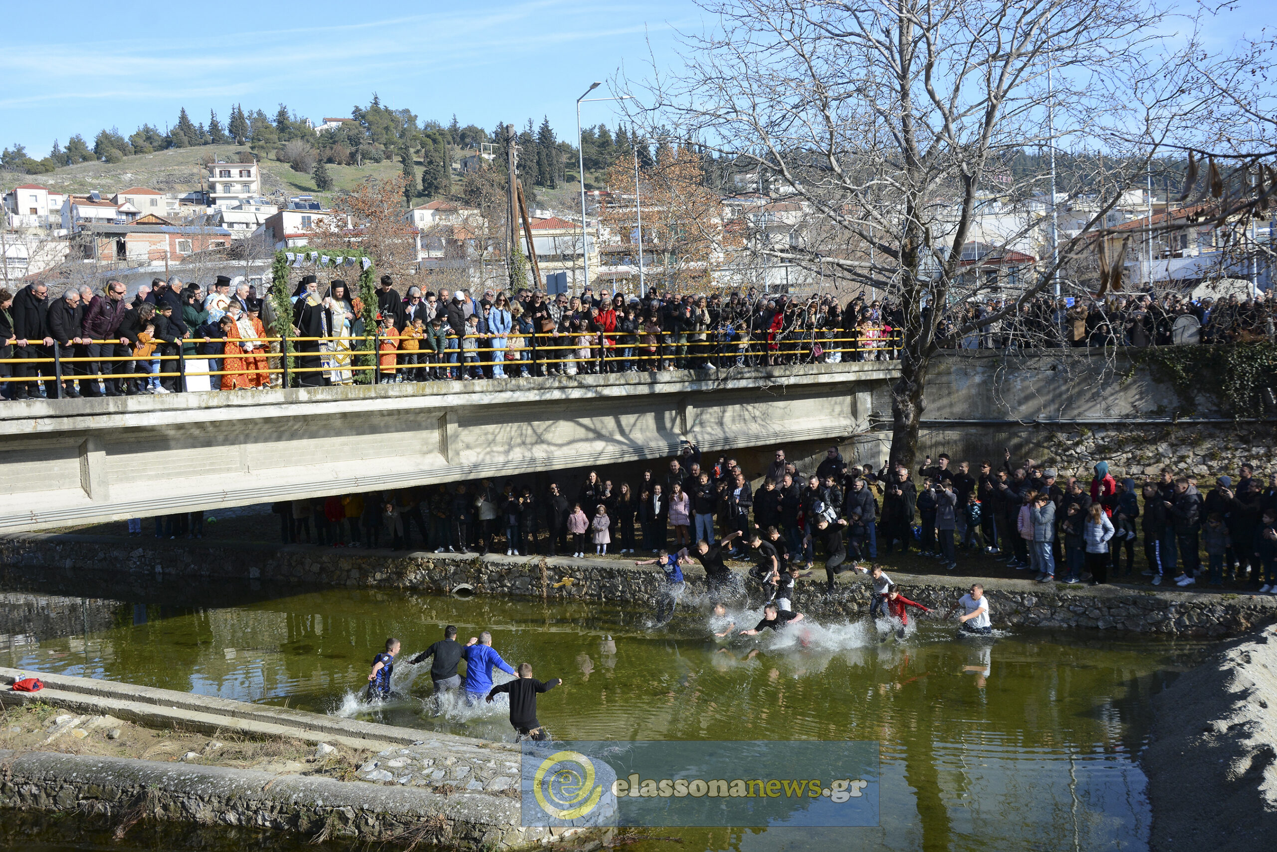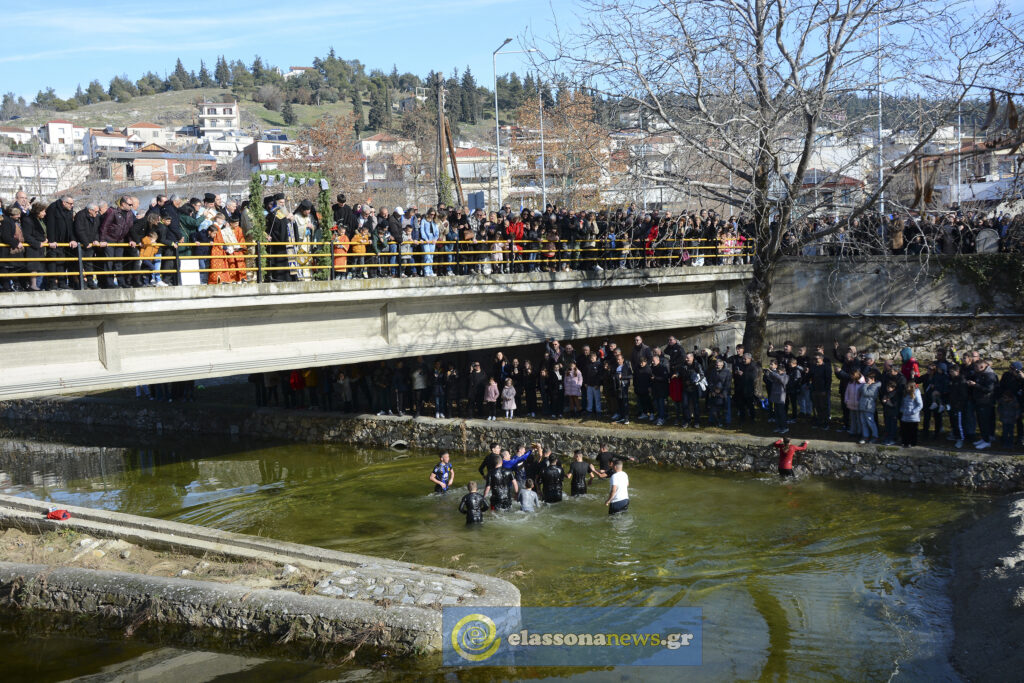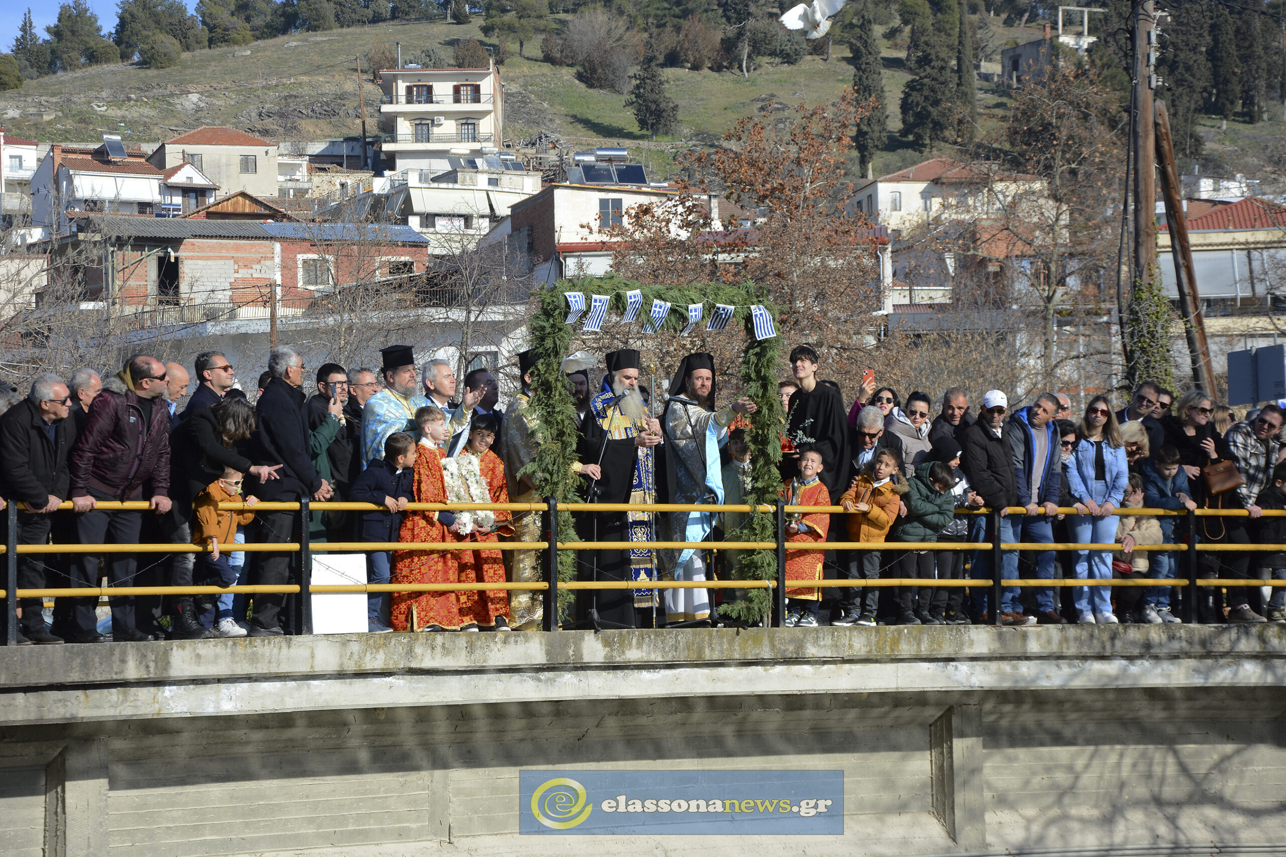 Στη συνέχεια, λίγο μετά τις 10.30, σχηματίσθηκε πομπή, με επικεφαλής τη Φιλαρμονική του Δήμου Ελασσόνας (υπό τη διεύθυνση του αρχιμουσικού της κ. Δημ. Τσιαβέ), και κατευθύνθηκε στη γέφυρα του ποταμού Ελασσονίτη. Εκεί, όπως γίνεται κάθε χρόνο, κατά μήκος της κοίτης του ποταμού, κάτω από την «παγωμένη» λιακάδα, είχαν συγκεντρωθεί πολλοί Ελασσονίτες από όλες τις ενορίες της πόλης, για να παρακολουθήσουν την καθιερωμένη ρίψη του Τιμίου Σταυρού. Ο μητροπολίτης κ. Χαρίτων, αφού άφησε ελεύθερα να πετάξουν στον ουρανό τα λευκά περιστέρι, έριξε τον Σταυρό στα νερά του Ελασσονίτη, όπου βούτηξαν τολμηροί νεαροί κολυμβητές.