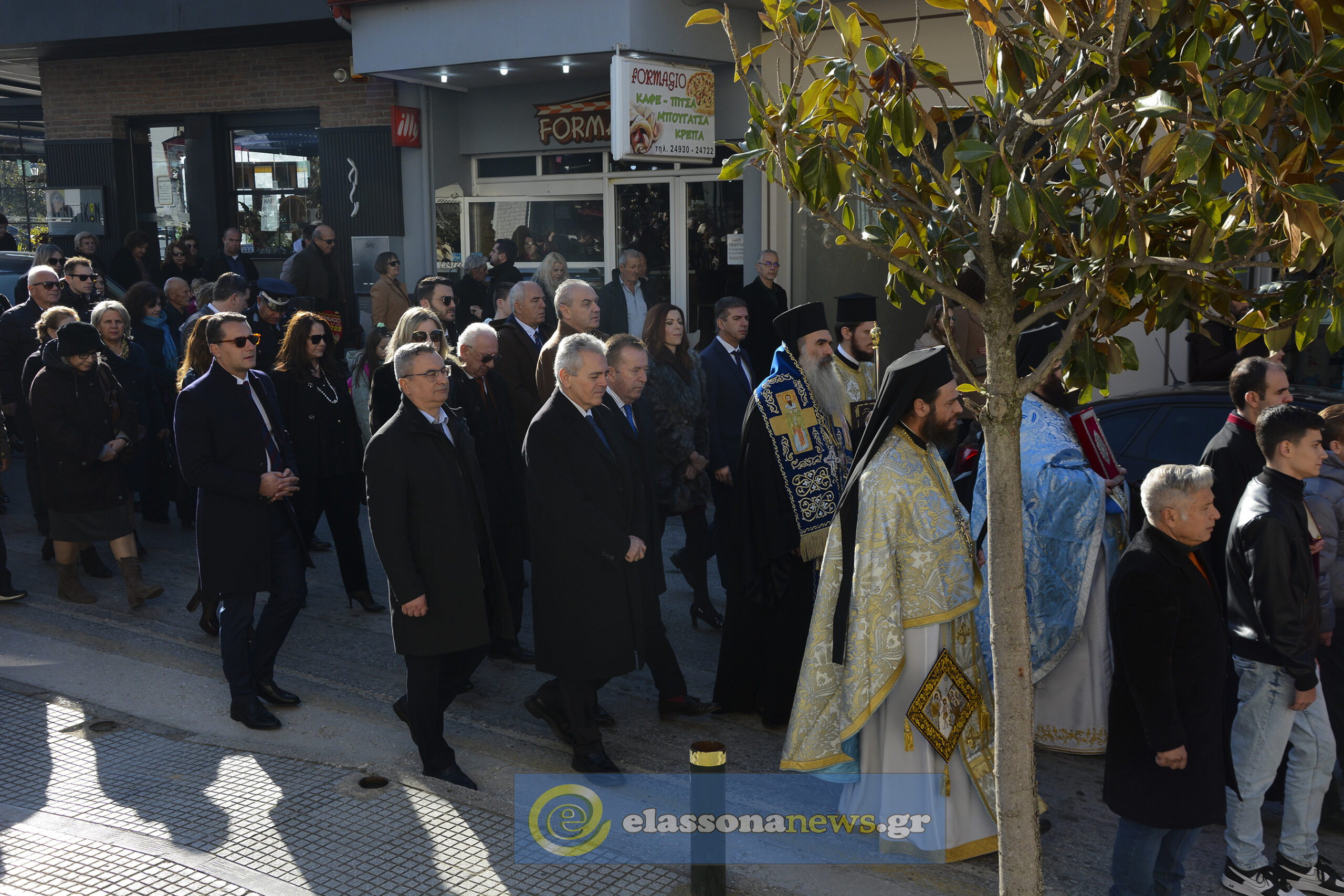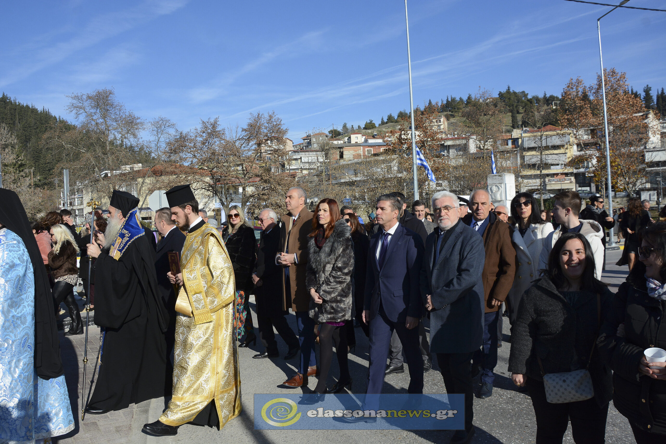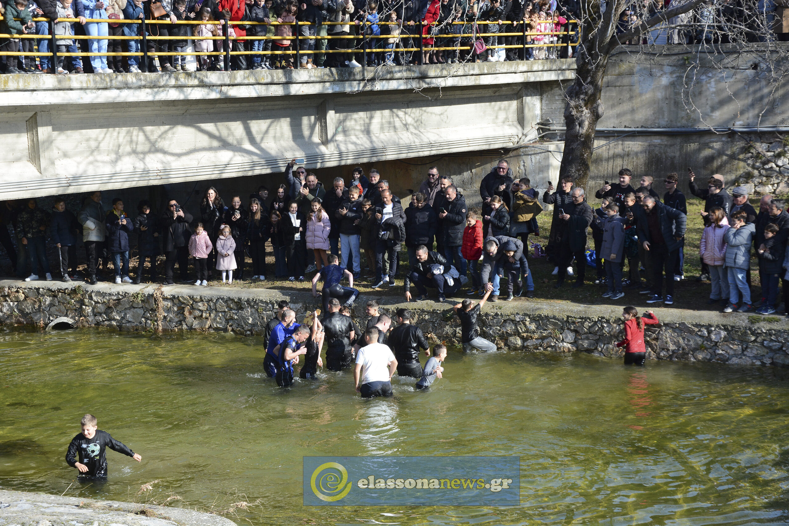 Στη συνέχεια, λίγο μετά τις 10.30, σχηματίσθηκε πομπή, με επικεφαλής τη Φιλαρμονική του Δήμου Ελασσόνας (υπό τη διεύθυνση του αρχιμουσικού της κ. Δημ. Τσιαβέ), και κατευθύνθηκε στη γέφυρα του ποταμού Ελασσονίτη. Εκεί, όπως γίνεται κάθε χρόνο, κατά μήκος της κοίτης του ποταμού, κάτω από την «παγωμένη» λιακάδα, είχαν συγκεντρωθεί πολλοί Ελασσονίτες από όλες τις ενορίες της πόλης, για να παρακολουθήσουν την καθιερωμένη ρίψη του Τιμίου Σταυρού. Ο μητροπολίτης κ. Χαρίτων, αφού άφησε ελεύθερα να πετάξουν στον ουρανό τα λευκά περιστέρι, έριξε τον Σταυρό στα νερά του Ελασσονίτη, όπου βούτηξαν τολμηροί νεαροί κολυμβητές.