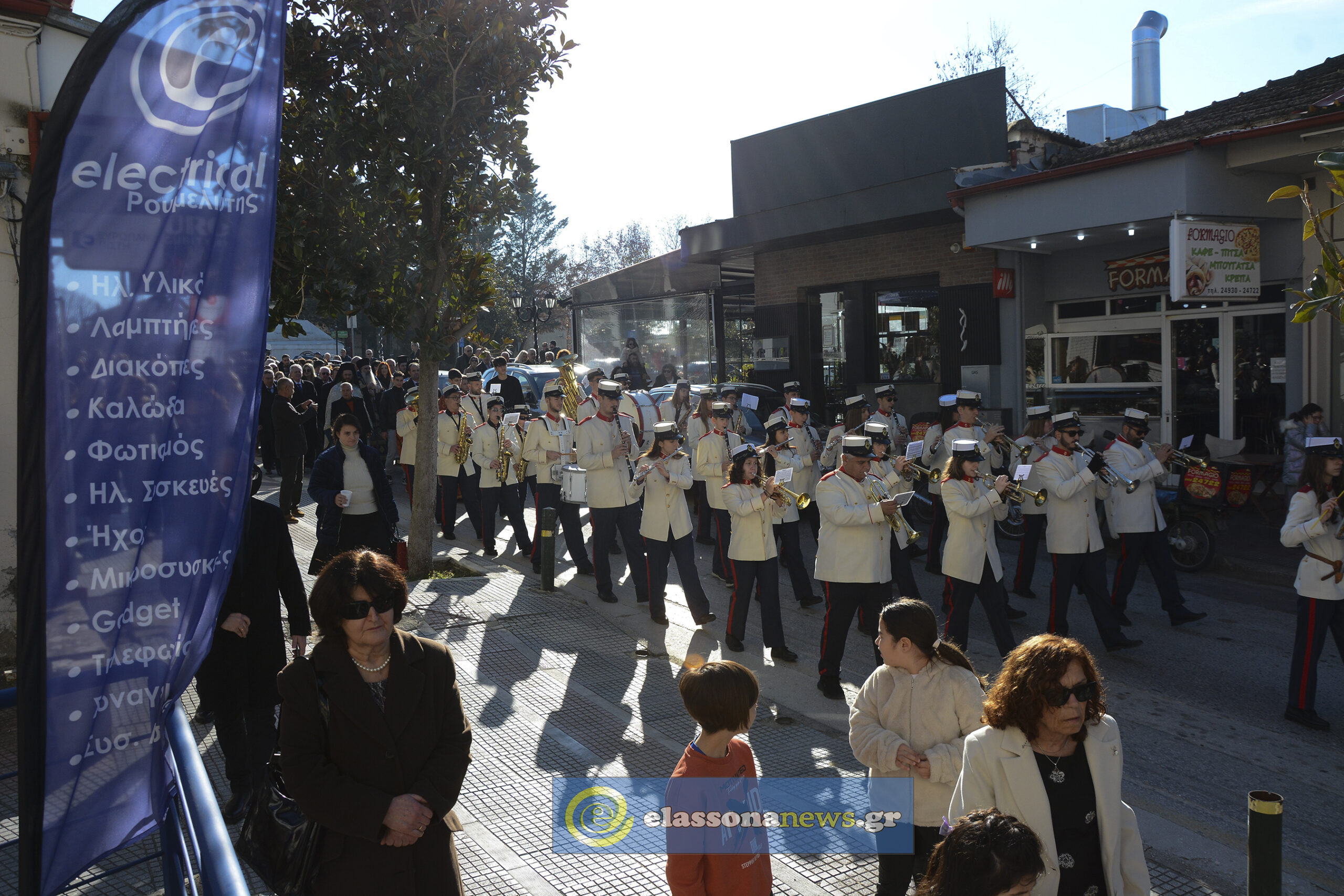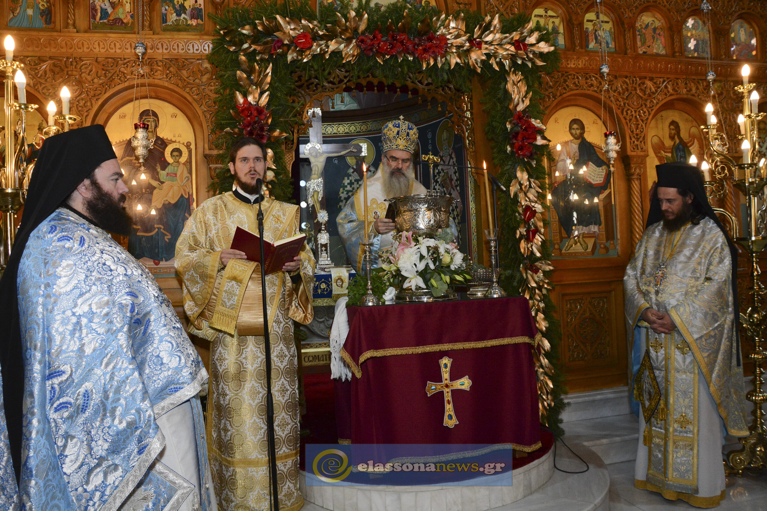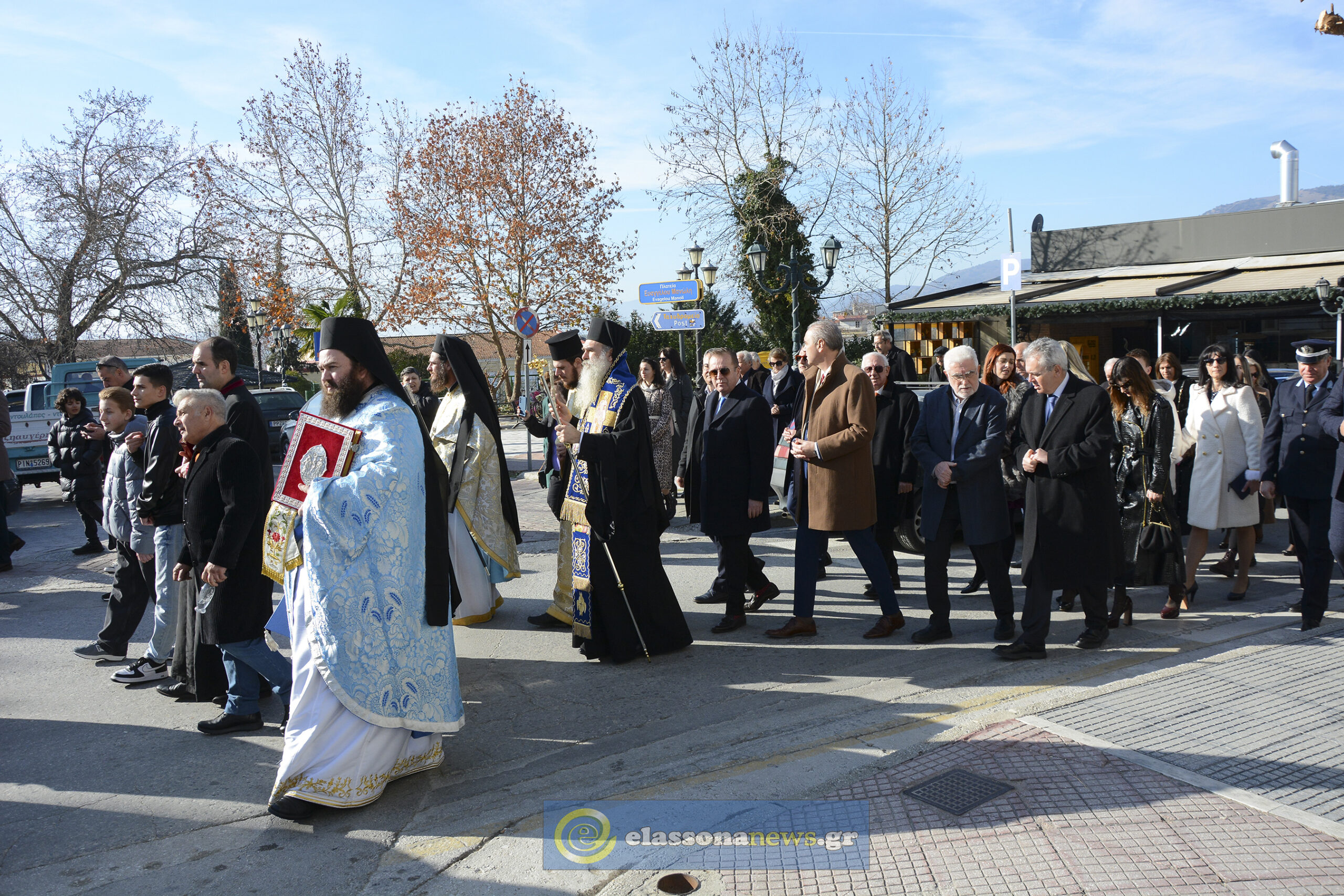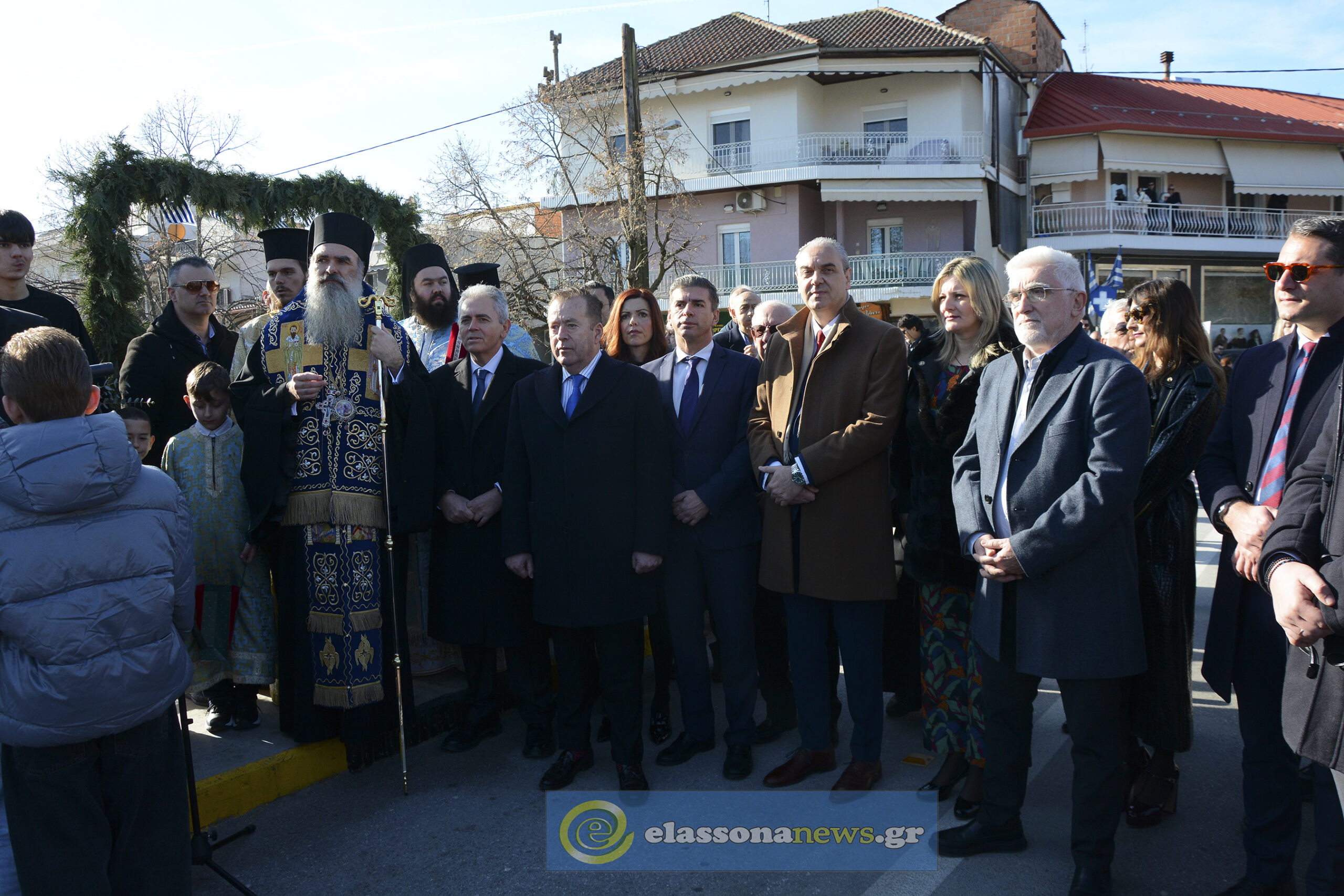 Στη συνέχεια, λίγο μετά τις 10.30, σχηματίσθηκε πομπή, με επικεφαλής τη Φιλαρμονική του Δήμου Ελασσόνας (υπό τη διεύθυνση του αρχιμουσικού της κ. Δημ. Τσιαβέ), και κατευθύνθηκε στη γέφυρα του ποταμού Ελασσονίτη. Εκεί, όπως γίνεται κάθε χρόνο, κατά μήκος της κοίτης του ποταμού, κάτω από την «παγωμένη» λιακάδα, είχαν συγκεντρωθεί πολλοί Ελασσονίτες από όλες τις ενορίες της πόλης, για να παρακολουθήσουν την καθιερωμένη ρίψη του Τιμίου Σταυρού. Ο μητροπολίτης κ. Χαρίτων, αφού άφησε ελεύθερα να πετάξουν στον ουρανό τα λευκά περιστέρι, έριξε τον Σταυρό στα νερά του Ελασσονίτη, όπου βούτηξαν τολμηροί νεαροί κολυμβητές.