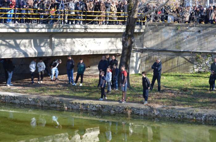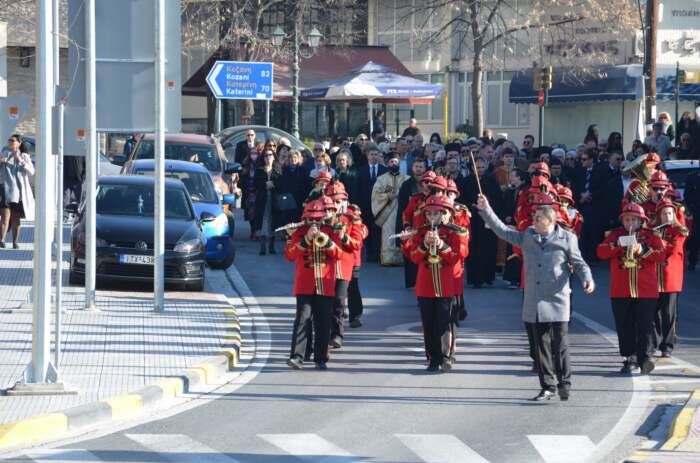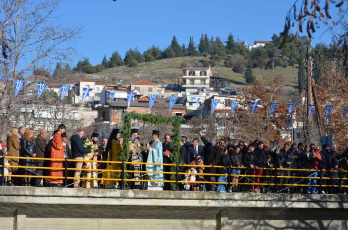 Στη συνέχεια, λίγο μετά τις 10.30, σχηματίσθηκε πομπή, με επικεφαλής τη Φιλαρμονική του Δήμου Ελασσόνας (υπό τη διεύθυνση του αρχιμουσικού της κ. Δημ. Τσιαβέ), και κατευθύνθηκε στη γέφυρα του ποταμού Ελασσονίτη. Εκεί, όπως γίνεται κάθε χρόνο, κατά μήκος της κοίτης του ποταμού, κάτω από την «παγωμένη» λιακάδα, είχαν συγκεντρωθεί πολλοί Ελασσονίτες από όλες τις ενορίες της πόλης, για να παρακολουθήσουν την καθιερωμένη ρίψη του Τιμίου Σταυρού. Ο μητροπολίτης κ. Χαρίτων, αφού άφησε ελεύθερα να πετάξουν στον ουρανό τα λευκά περιστέρι, έριξε τον Σταυρό στα νερά του Ελασσονίτη, όπου βούτηξαν 3 τολμηροί νεαροί κολυμβητές.
