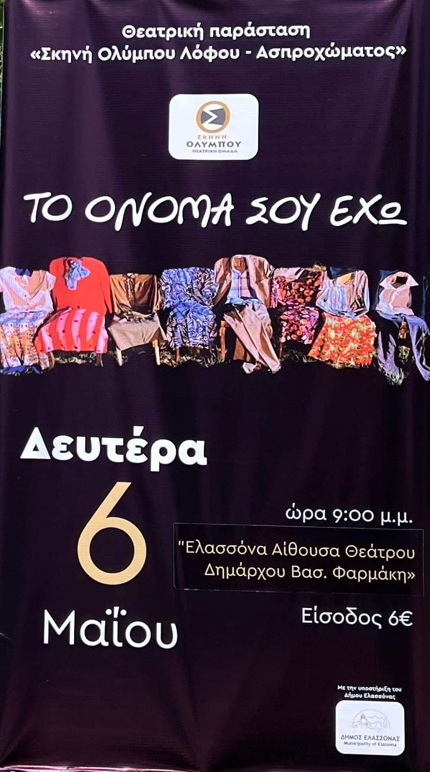 Μετά τη μεγάλη επιτυχία που γνώρισε η παράσταση «Το όνομά σου έχω» στην πρώτη παρουσίασή της στον Λόφο Ολύμπου το περασμένο καλοκαίρι, ο Δήμος Ελασσόνας συμμετέχει και φέτος στη διοργάνωση της συγκλονιστικής θεατρικής παράστασης, η οποία θα παρουσιαστεί την Δευτέρα του Πάσχα 6 Μαΐου 2024 στις 9 το βράδυ στην Αίθουσα Θεάτρου «Δημάρχου Βασ. Φαρμάκη» στην Ελασσόνα.