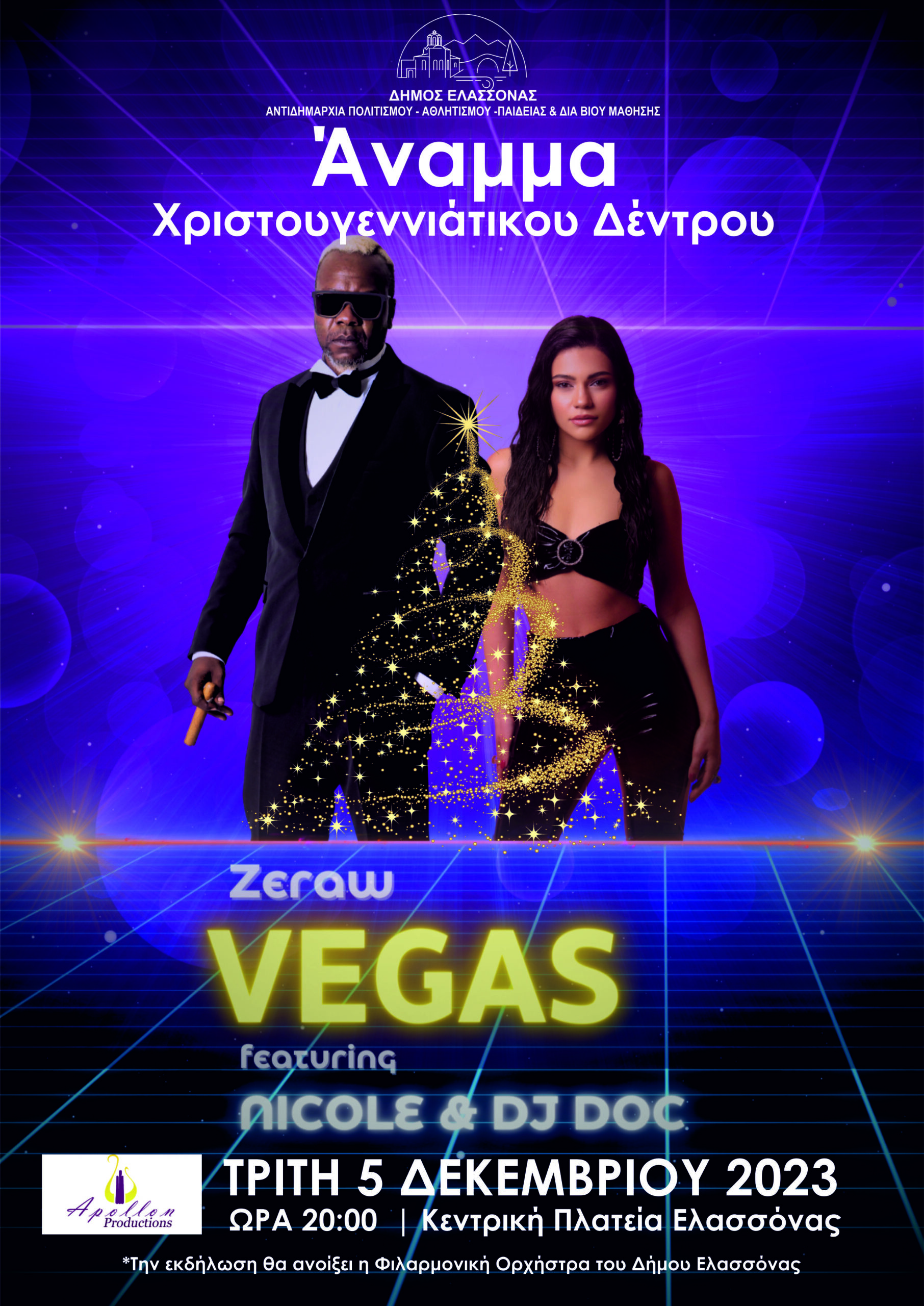 Με το δημοφιλές συγκρότημα «VEGAS» και τη συμμετοχή της Φιλαρμονικής Ορχήστρας του Δήμου Ελασσόνας θα πραγματοποιηθεί το άναμμα του χριστουγεννιάτικου δέντρου στην Κεντρική Πλατεία Ελασσόνας αύριοΤρίτη 5 Δεκεμβρίου.