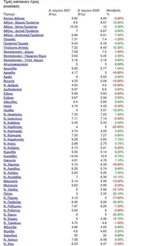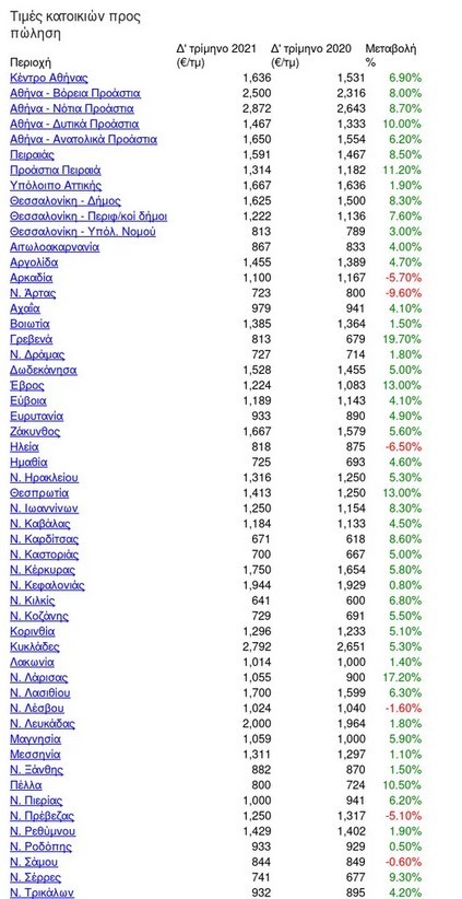 Κατά τη διάρκεια του Οκτωβρίου-Δεκεμβρίου 2021, η μέση τιμή για τα σπίτια προς πώληση ήταν υψηλότερη στα Νότια Προάστια της Αθήνας, με 2,872€ ανά τετραγωνικό μέτρο και χαμηλότερη στη Φλώρινα με 550€ ανά τετραγωνικό μέτρο. Η μεγαλύτερη αύξηση σε αυτό το τρίμηνο σε σχέση με το προηγούμενο έτος, καταγράφηκε στα Γρεβενά με +19,70%, ενώ η μεγαλύτερη μείωση στο Νομό Άρτας με -9,60%.