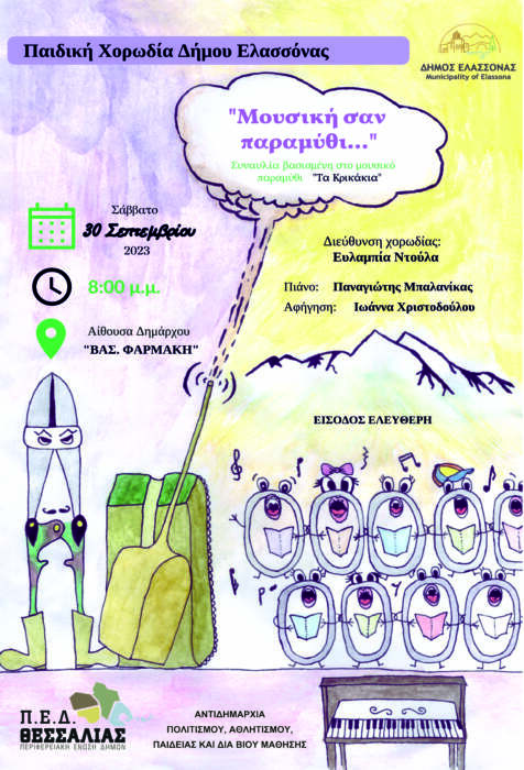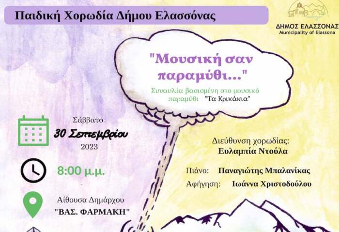 H Αντιδημαρχία Πολιτισμού, Αθλητισμού, Παιδείας και Δια Βίου Μάθησης του Δήμου Ελασσόνας και η Περιφερειακή Ένωση Δήμων Θεσσαλίας σας προσκαλούν στη συναυλία «Μουσική σαν παραμύθι» με τα σύνολα της Παιδικής Χορωδίας Δήμου Ελασσόνας, το Σάββατο 30 Σεπτεμβρίου 2023, ώρα 8:00 μ.μ., στην αίθουσα «Δημάρχου Β. Φαρμάκη», στην Ελασσόνα.
