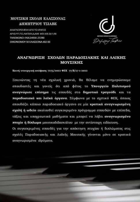 Μουσική σχολή Ελασσόνας: Αναγνώριση σχολών παραδοσιακής και λαικής μουσικής