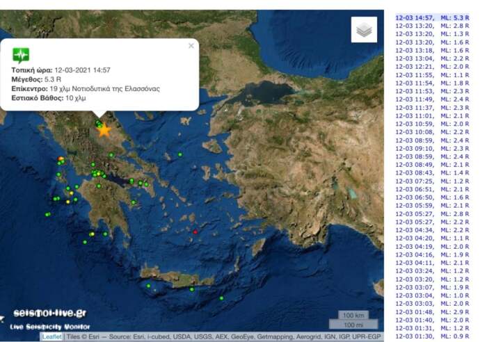 Η έντασή του ήταν 5,3 της κλίμακας Ρίχτερ και σημειώθηκε στις 2.57 το μεσημέρι της Παρασκευής, με εστιακό βάθος 10 χλμ και επίκεντρο 19 χλμ Νοτιοδυτικά της Ελασσόνας.