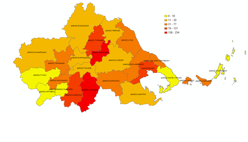 Ο παρακάτω πίνακας και οι χάρτες αποτυπώνουν τη γεωγραφική κατανομή των συνολικών κρουσμάτων και της επίπτωσης COVID-19 από 14 Μαρτίου έως 17Δεκεμβρίου και από 18 έως 31 Δεκεμβρίου ανά Καλλικρατικό Δήμο της Περιφέρειας Θεσσαλίας, με βάση την δηλωθείσα διεύθυνση μόνιμης κατοικίας του κρούσματος ή τη διεύθυνση προσωρινής διαμονής για τους τουρίστες και άλλους προσωρινά διαμένοντες στην Ελλάδα. Συμπεριλαμβάνονται τόσο κρούσματα με ιστορικό ταξιδίου (“εισαγόμενα”) όσο και κρούσματα με πιθανή εγχώρια μετάδοση.