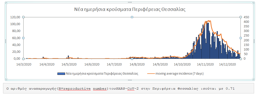 Από την Περιφέρεια Θεσσαλίας παρουσιάζεται η ημερήσια κατανομή των επιβεβαιωμένων κρουσμάτων και ο αριθμός αναπαραγωγής R (R=reproductive number) για την Περιφέρεια Θεσσαλίας.